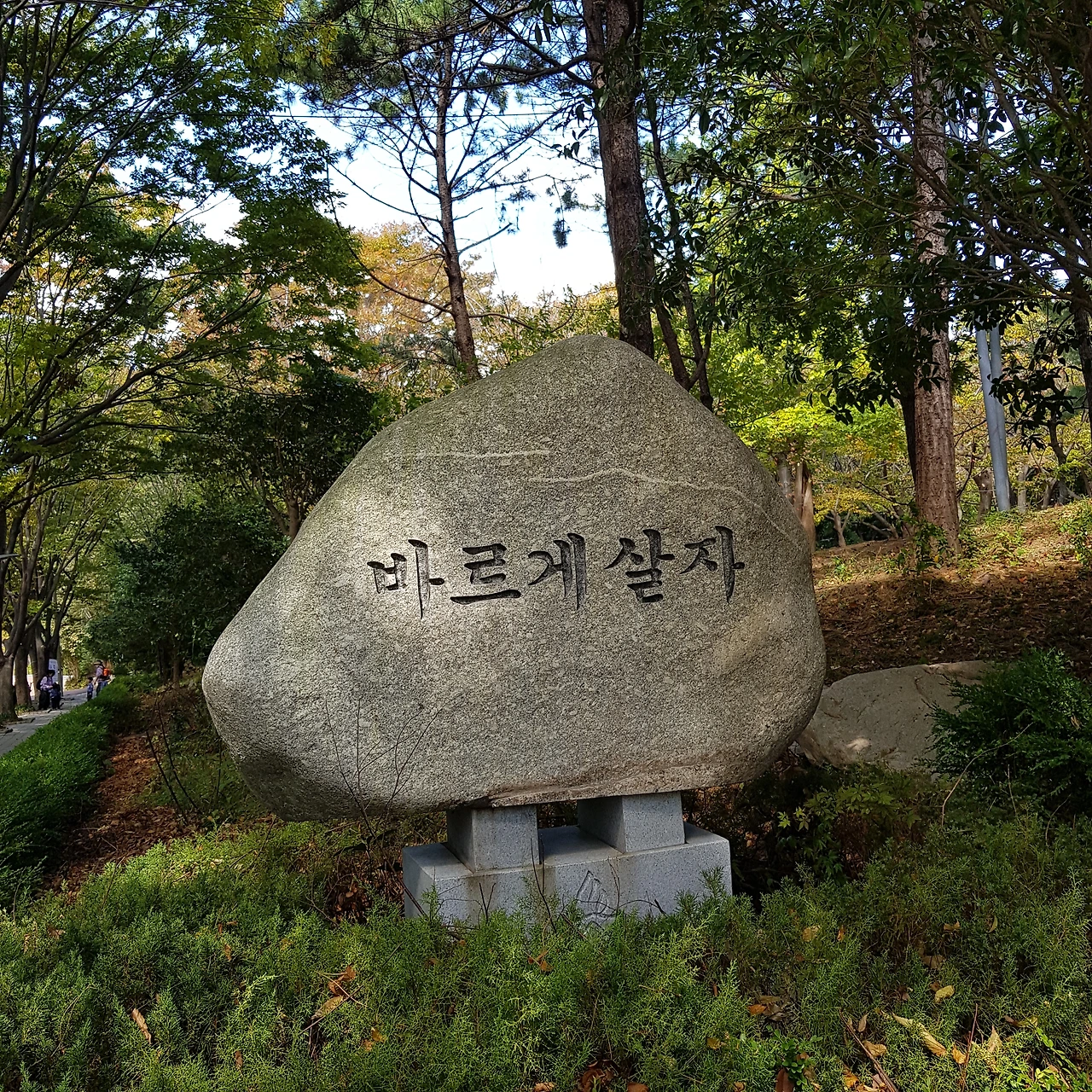 부잣동네라 그런지 산 초입에 있는 공원에 큼지막한 공영주차장이 마련되어 있어서 주차 걱정 없이 편하게 주차를 시키고 가벼운 마음으로 룰루랄라~ 발걸음을 옮겼다. 그런데 공원 입구에 서 있는 커다란 돌에 새겨진 글귀가 눈에 들어오자 나도 모르게 모자를 바로 쓰고 옷깃을 한번 더 여미게 되었다.