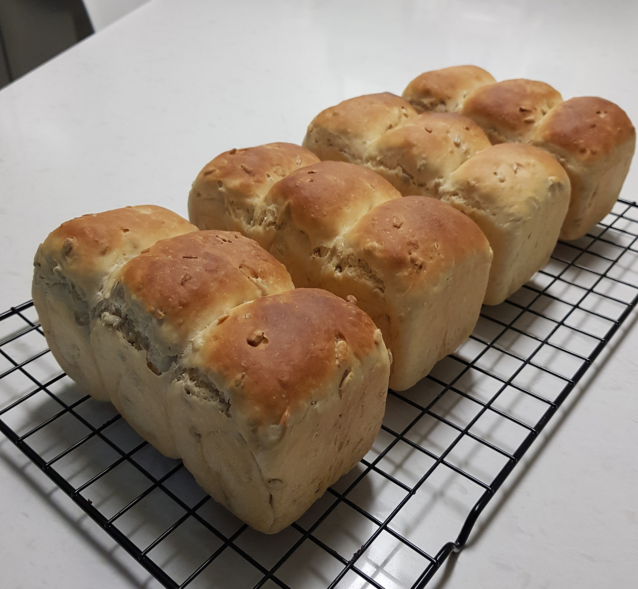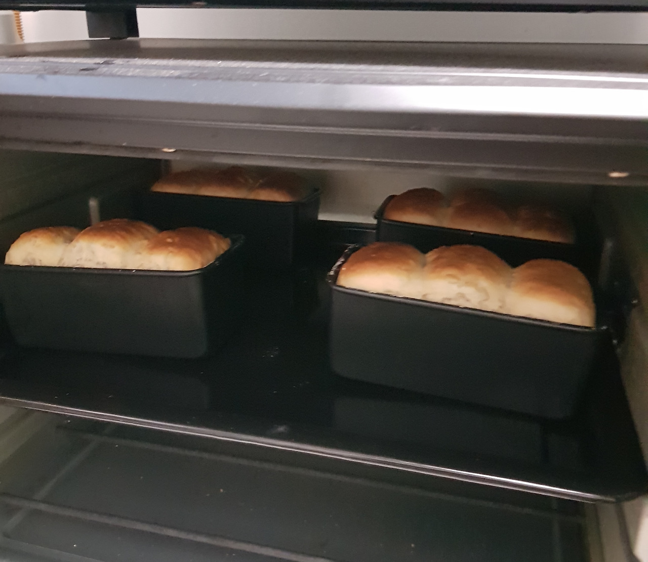 미리 달궈둔 오븐에 넣어서 180°C에서 25분가량 구워주면 됩니다. 수시로 확인하고 윗면에 색이 많이 나면 유산지를 덮어 색조절을 해줍니다. 완성된 식빵은 식힘망에서 충분히 식힌 후 비닐 포장하여 완성합니다.