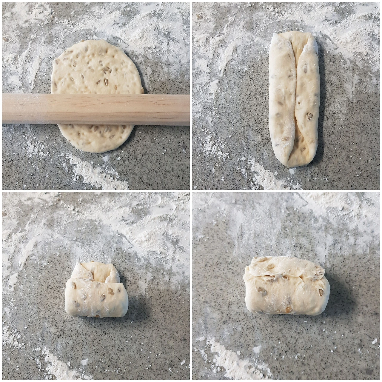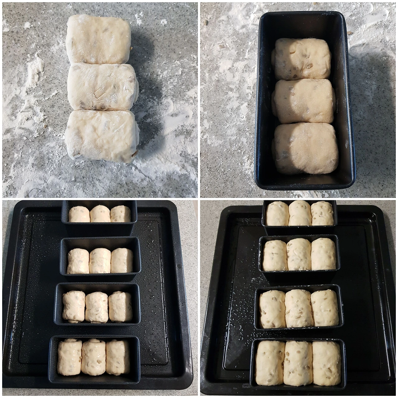 둥글리기한 반죽 한 개를 밀대로 밀어 타원형을 만든 후 양 옆을 접어주고 동그랗게 말아서 끝을 꼭꼭 눌러 잘 여며 줍니다. 식빵팬 하나에 반죽을 세 개씩 넣고 반죽이 마르지 않게 위면에 물을 뿌려 준 후 팬 높이까지 반죽이 부풀어 오를 때까지 2차 발효를 합니다.