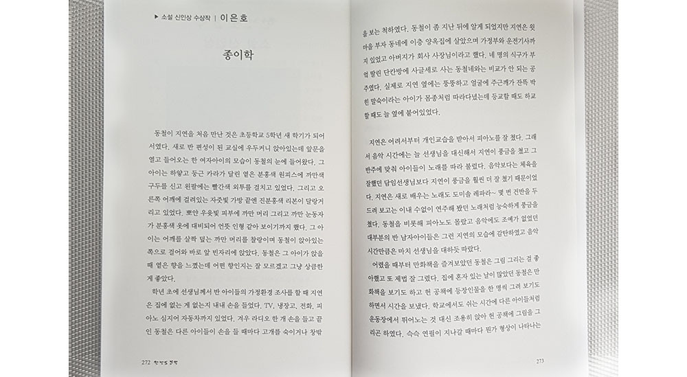 "이은호의 소설 '종이학'은 황순원의 '소나기'를 연상하게 하는 스토리 텔링이다. 시골 초등학교 소년과 소녀의 나긋한 사랑 이야기가 다소 뻔하게 전개된 것이다. 획기적 반전이나 심리적 갈등이 별로 없다. 그러나 소설가로서 이야기를 풀어나가는 힘과 서사구조가 단단하여 앞으로 기대해 볼만하다."
