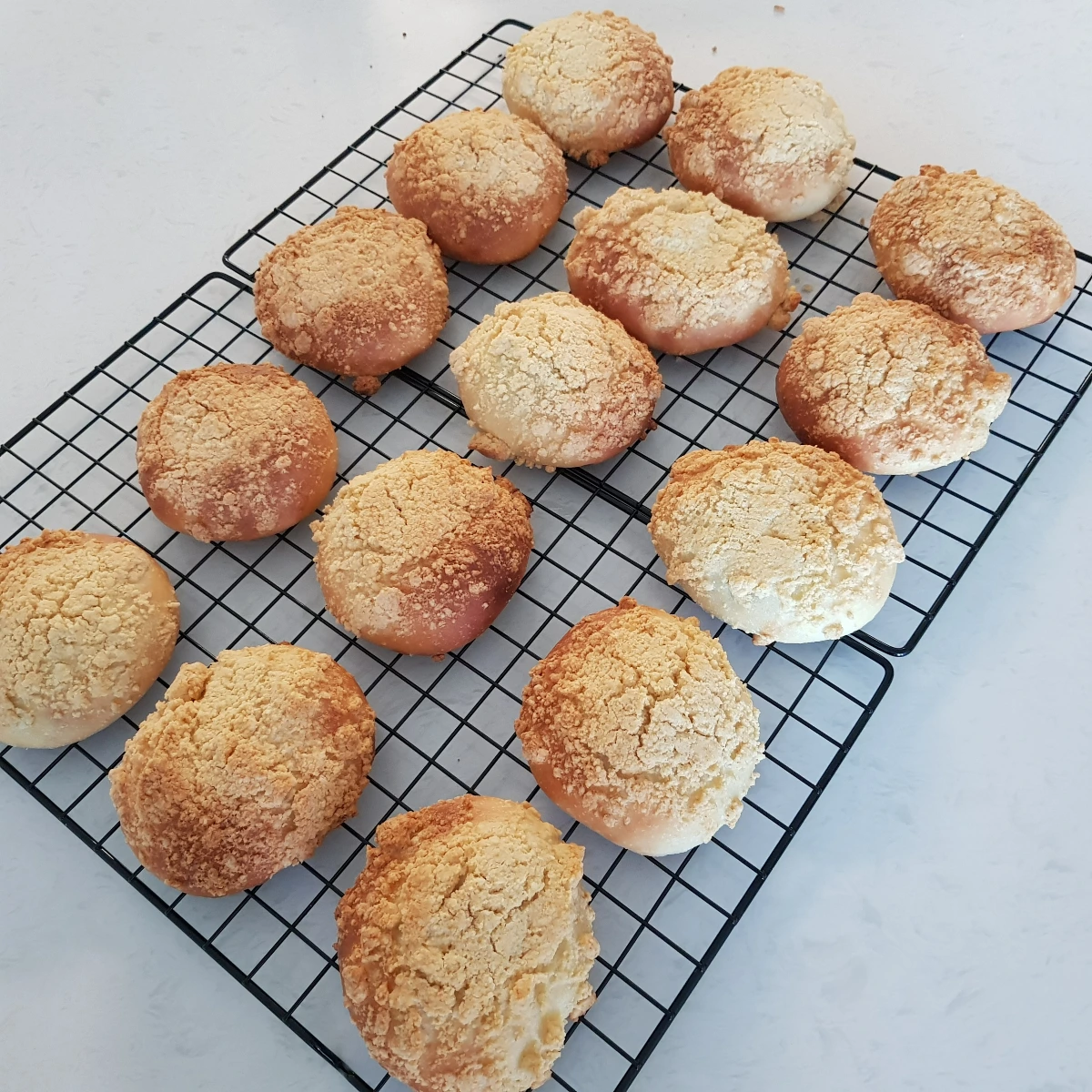 작업 순서는 먼저 반죽하고, 1차 발효하는 사이 소보로 만들고, 발효 끝난 반죽 50g씩 분할하여 둥글리기 하고, 팥앙금 40g씩 분할하고 나면 준비 끝. 이어서 본격적으로 단팥소보로빵 성형시작. 반죽 동그랗게 펴서 속에 팥앙금 넣고 감싸고, 물 묻혀 소보로 붙이고, 팬닝. 그리고 2차 발효. 마지막으로 오븐에 넣고 굽기.참 쉽다.