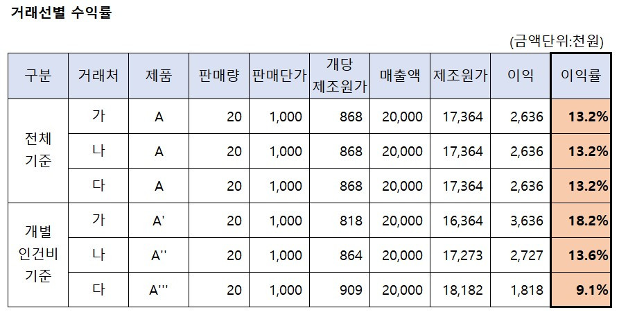 만들어진 제품들이 거래처에 팔려나간다. 이번에는 거래처별로 수익성 분석을 해야 할 차례이다. 전체 인건비평균을 기준으로 원가계산을 한 경우에는 가, 나, 다 거래선 동일하게 이익률이 13.2%로 나온다. 하지만 개별 인건비를 기준으로 원가계산을 한 경우에는 낮은 인건비가 적용된 A'를 가져간 가 거래처의 이익률이 18.2%로 가장 높게 나오고, 나 거래처가 13.6%, 다 거래처가 9.1%가 나온다.