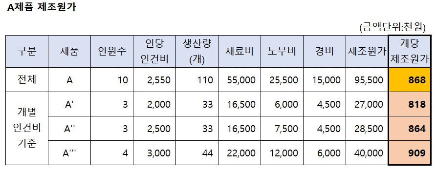 위의 표에서 보듯이 다른 조건은 다 같다고 보았을 때, 인건비의 전체평균을 적용하여 계산하면 A제품의 개당 제조원가가 868천원이 된다. 반면에 인당 인건비가 각각 다른 세 개의 그룹 A', A'', A'''로 구분하여 계산하면, 각각 818천원, 864천원, 909천원이 된다. 똑같은 A제품이지만 누가 만들었느냐에 따라 제조원가가 달라지는 것이다.