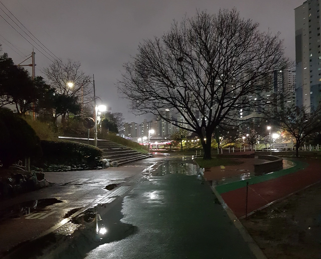 긴 시간 동안 고기 먹고 식사하고 아이스크림으로 입가심하고 나니 드디어 마칠 시간이 되었다.얼마 남지 않은 올 한 해 무탈하게 보내고 내년에 건강한 모습으로 다시 만날걸 기약하며 헤어졌다. 밖에는 여전히 비가 내렸고, 우산을 받쳐 들고 집으로 가기 위해 전철역으로 향했다. 식당에서 얼마나 시끄러웠는지 우산을 때리는 빗소리에 섞여 왁자지껄 떠드는 소리가 귓가에 윙윙 맴도는 듯했다. 그런데 불현듯 우리 동네 하천변 산책로가 생각났다. 이렇게 비 오는 밤, 그 길도 호젓하겠지? 싶었던 것이다.
