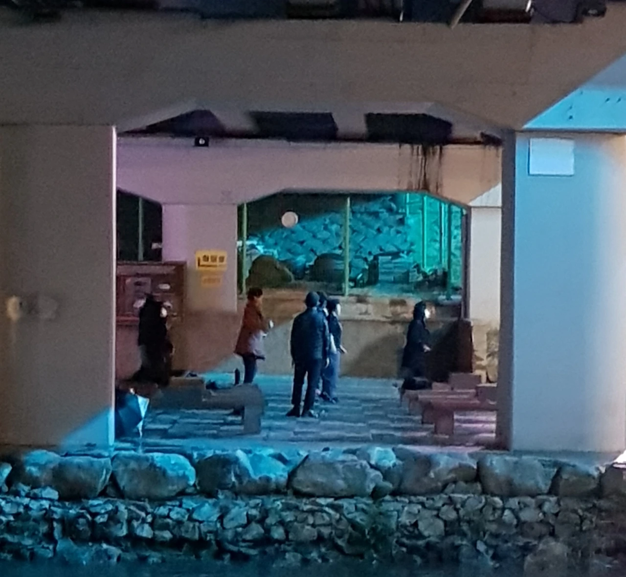 한참 사색에 잠겨 걷고 있는데 어디선가 익숙한 멜로디가 흘러나왔다. 걸음을 옮길수록 노랫소리는 커졌고 눈앞에 익숙한 풍경이 나타났다. 아, 바로 아주머니들의 라인댄스! 비 오는 날, 비를 피해 다리밑에서 밤늦은 시간에 열정을 불태우는 아주머니들. 십여분의 아주머니들이 다리밑에서 스텝, 스으텝을 밟고 계셨다.