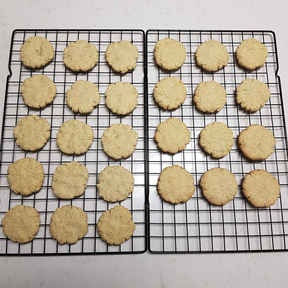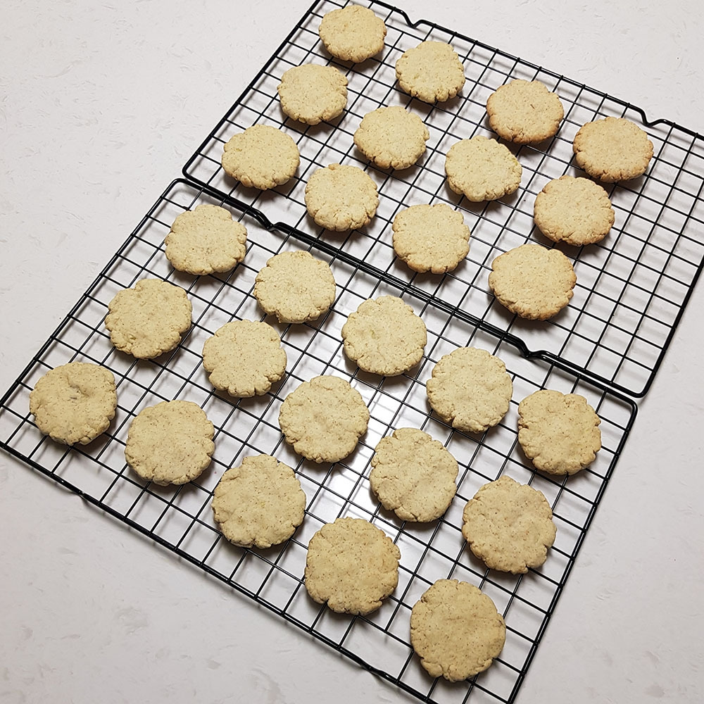 미리 달궈둔 오븐에 팬을 넣고 190°C 온도로 10분 정도 구워주면 됨. 너무 오래 구우면 쿠키가 딱딱해지므로 고온에서 짧은 시간으로 구워야 함. 구워진 쿠키를 식힘망에 올려 식힌 후 개별 포장하면 끝.