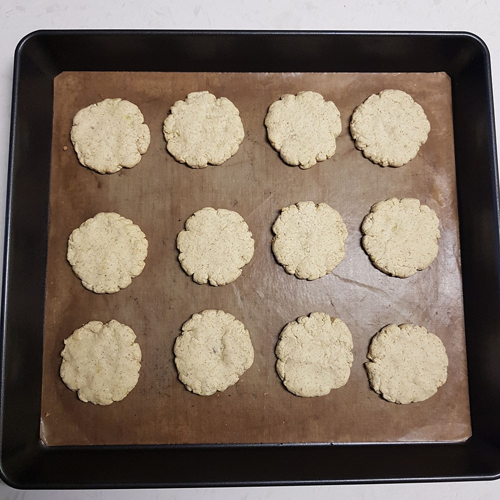 반죽을 35g씩 분할하여 동그랗게 뭉쳐준 뒤 적당한 간격을 두고 오븐팬 위에 올려놓는다. 손으로 꾹꾹 눌러 납작하게 만들되 수제쿠키 특유의 모양을 살리기 위해서 너무 매끈하게 정리하는 것보다는 끝이 투박하게 두는 것이 좋다.