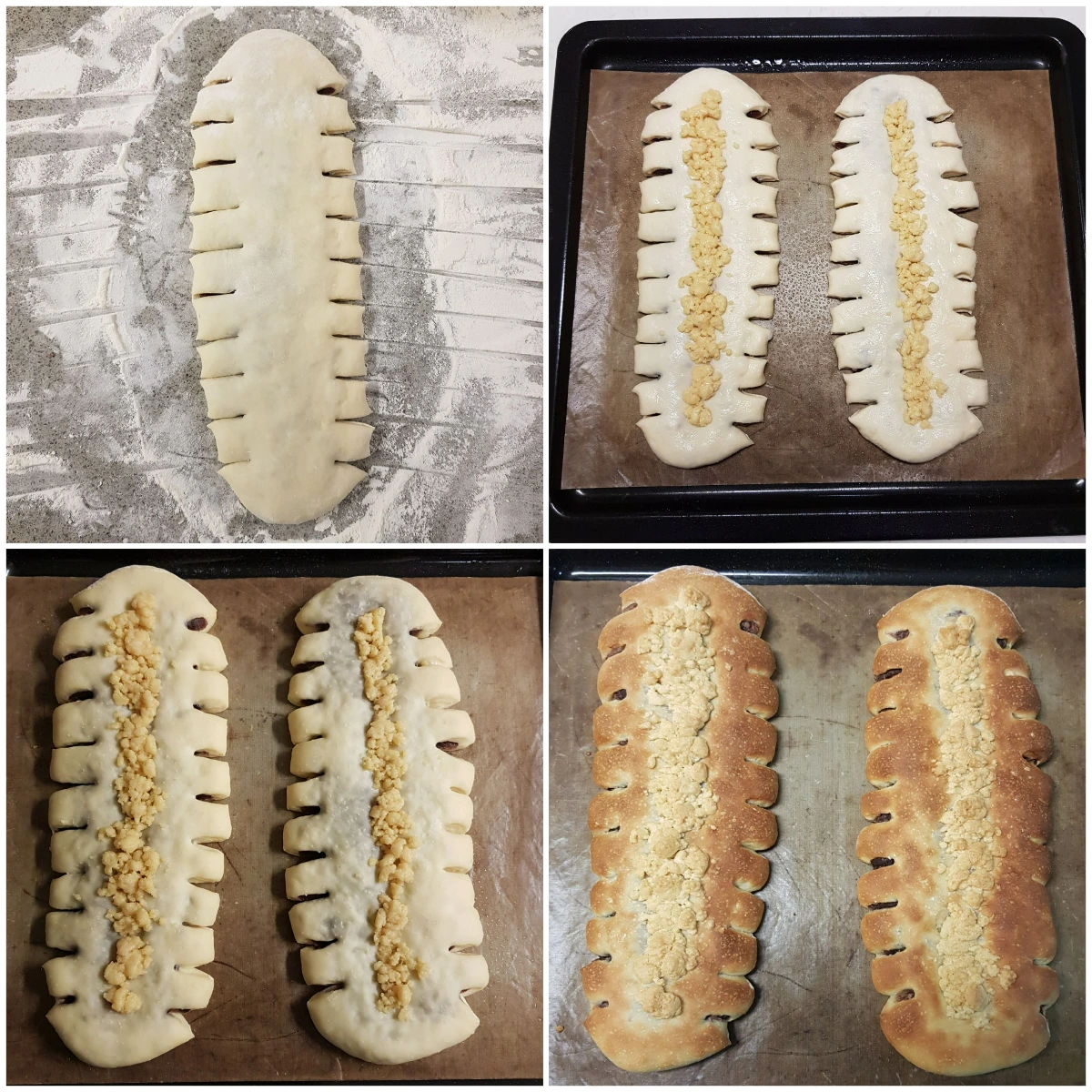 반죽을 밀대로 밀어 길이 35cm 정도의 긴 타원형으로 만들고, 그 위 가운데에 통팥앙금과 삶은 고구마를 차례로 길쭉하게 펴서 얹는다. 반죽 가장자리를 말아서 덮고 틈이 없도록 잘 여며준다. 전체적으로 살짝 눌러서 평평하게 해 주고, 가운데 부분을 세로로 밀대로 눌러 오목하게 하고 그 위에 물을 살짝 바르고 소보로를 얹는다. 성형된 빵의 양옆으로 열 개 정도의 칼집을 내어 갈비빵 모양을 잡아 준다.