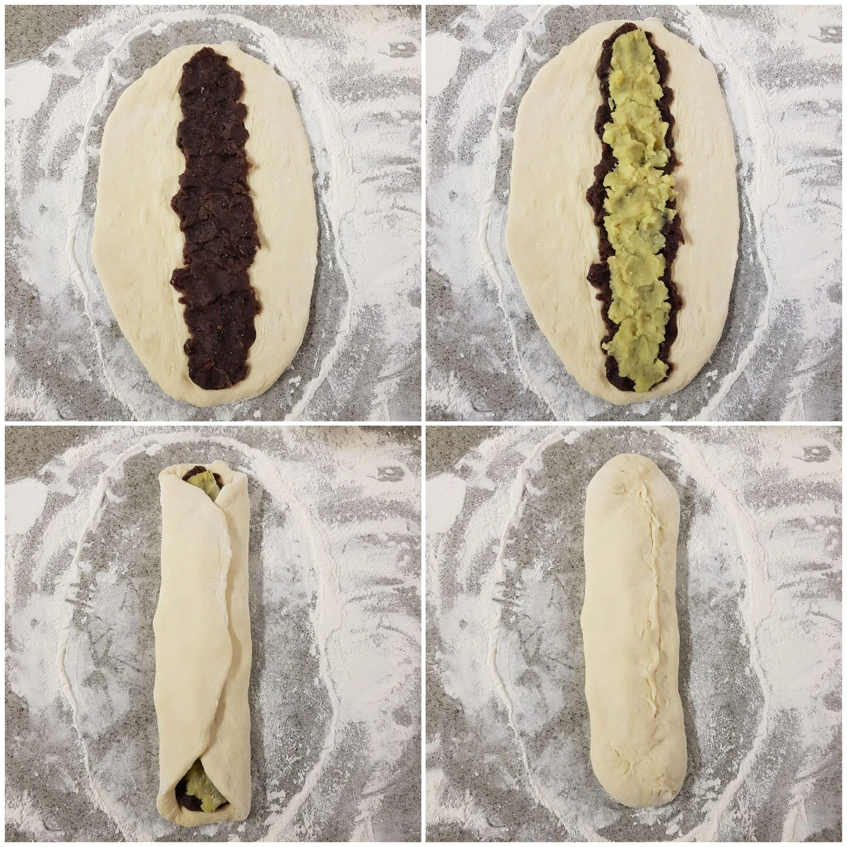 작업 순서는 먼저 반죽하여 부피가 2.5배 정도로 커질 때까지 1차 발효를 한다. 발효하는 사이 소보로를 만들어 놓는다. 1차 발효가 끝난 반죽을 350g씩 분할하여 둥글리기 하고, 통팥앙금 180g, 삶은 고구마 150g씩 분할하여 뭉쳐놓는다.