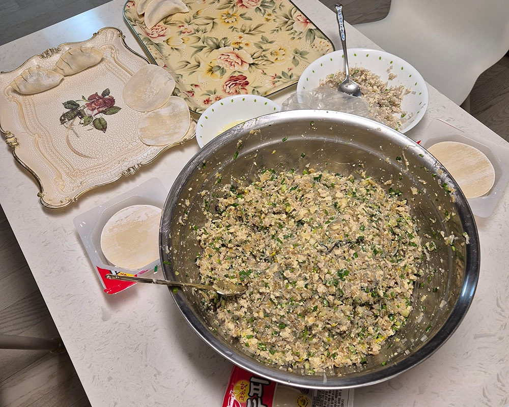 설 전날 만두를 빚었다. 우리 집은 명절음식을 따로 장만하지 않는다. 그냥 가족들과 먹을만한 음식 한두 가지만 준비할 뿐이다. 그런데 작년 가을에 아들이 결혼하고 나서 며느리와 처음 맞는 설명절이라, 그냥 넘어가기에는 섭섭해서 "우리 오랜만에 만두나 빚을까?" 했더니 모두 좋다고 하였다. 특히 아내가. 그래서 다저녁에 마트에 가서 재료를 사 와 우리 내외와 아들 내외 네 명이서 만두를 빚었다. 만두피는 마트에서 구매하였는데 왕만두피 6통을 샀다. 만두소에는 묵은 김치, 다진 돼지고기, 두부, 계란, 당면, 숙주나물, 쪽파, 부추, 다진 마늘, 후춧가루, 청양고추 등이 들어갔다.