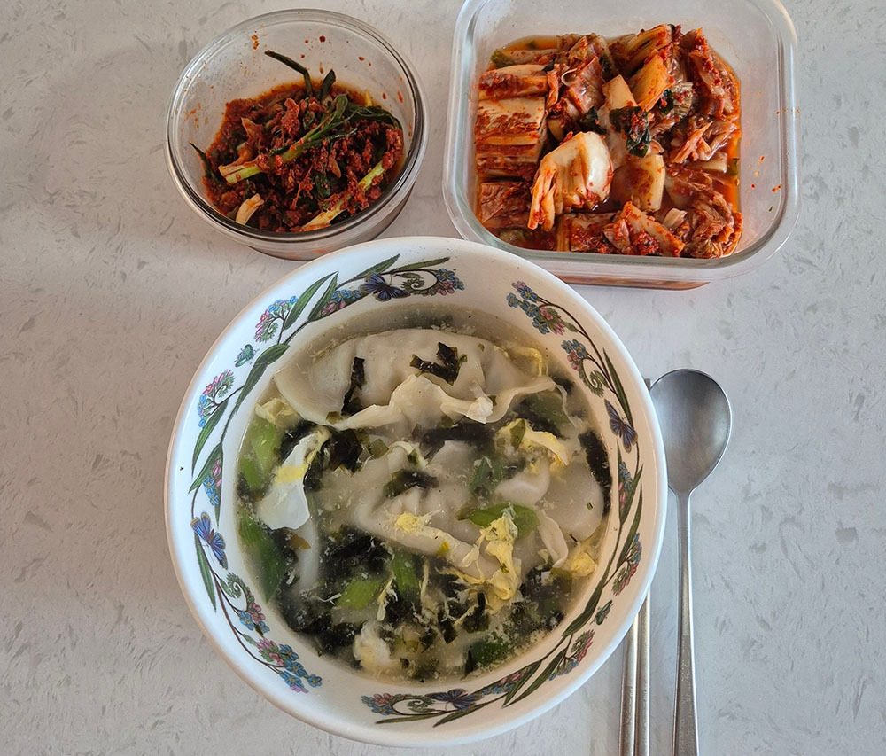 에라, 점심에는 떡만둣국이나 끓여 먹자 싶었다. 처음 끊여보는 건데 뭐 어렵지는 않을 것 같았다. 냉동실에서 만두 꺼내 놓고.. 오기로 내가 만든 만두만 꺼냈다. 그리고 떡국 떡은 물에 담가 놓고. 다싯물 준비하여 물 끓을 때 떡국 떡과 만두 넣고, 계란 풀고, 대파 넣고. 간은 순전히 소금만으로 하였다. 다 끓은 떡만둣국을 대접에 담고, 그 위에 먹다 남은 김 잘라서 올려주고, 후추 조금 뿌리고. 반찬은 배추김치와 파김치 두 가지면 족했다. 뭐혼자 먹는 건데.