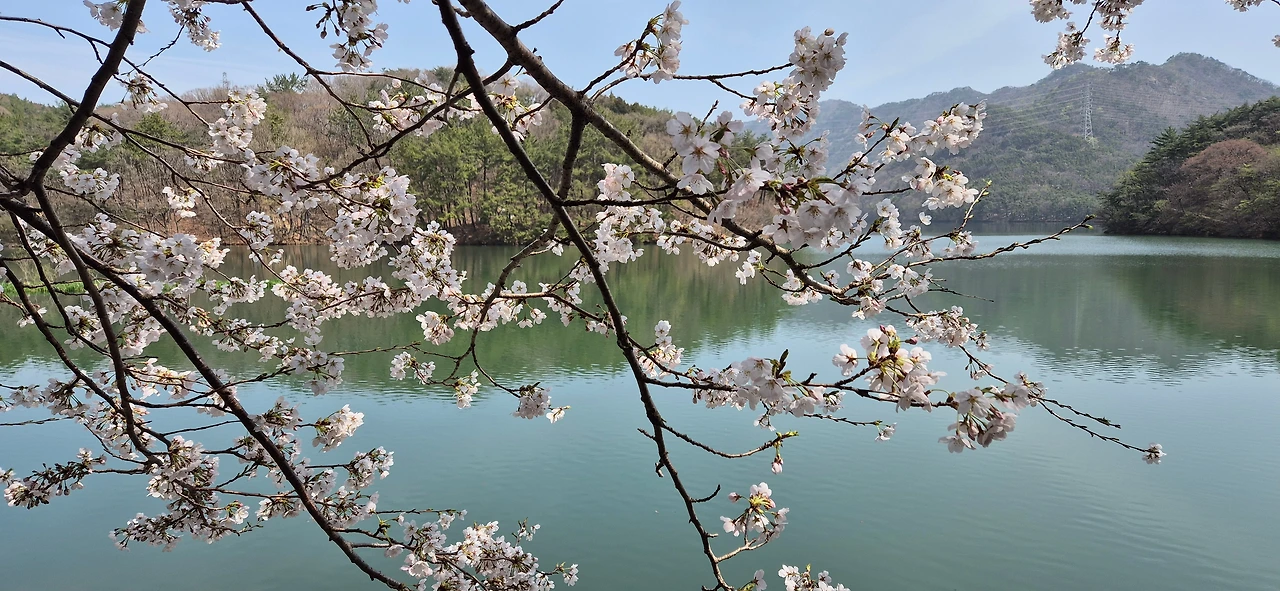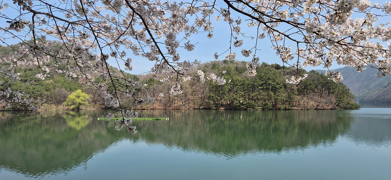 파란 하늘과 어우러진 연녹의 산과 물. 바람에 벚꽃이 하늘거린다.