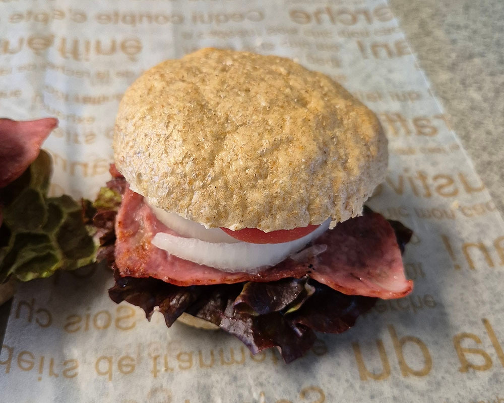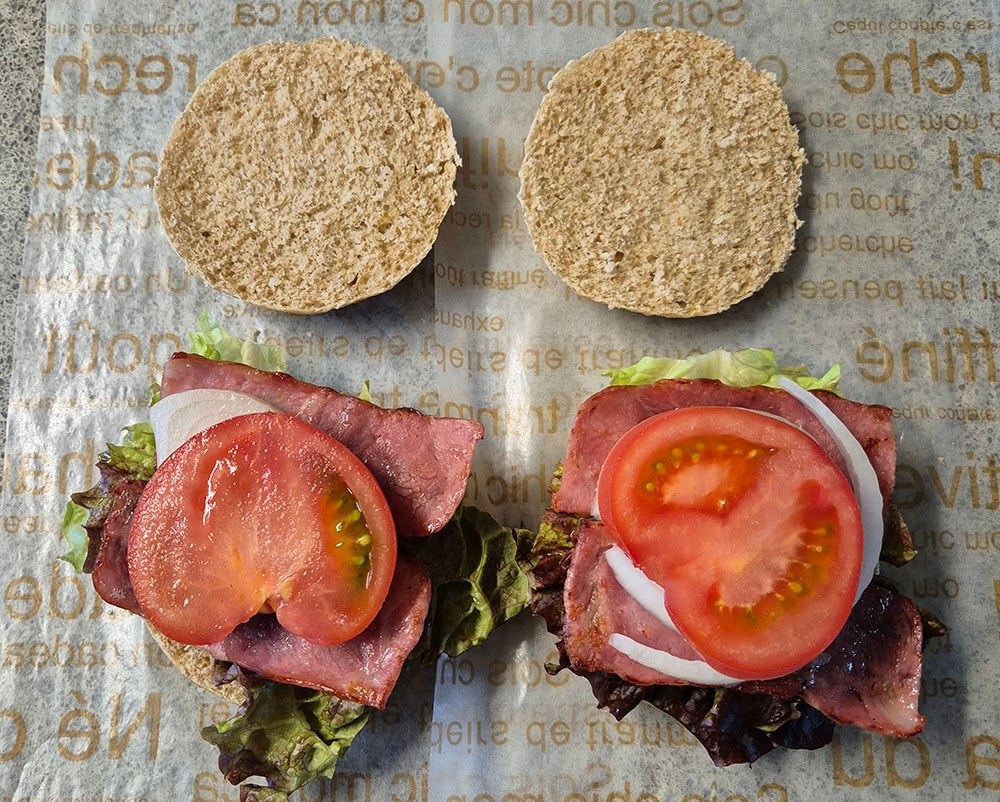 다음날 아침, 아침식사로 미니 햄버거를 만들었다. 빵을 가로로 반으로 자르고, 그 위에 상추, 베이컨, 양파, 토마토를 얹었다. 베이컨만 사고 나머지는 집에 있는 식재료 그대로 활용. 그리고 케첩과 마요네즈를 뿌리고 뚜껑 덮으면 끝. 5분 만에 끝났다. 초스피드로 아침 식사용 미니 햄버거 완성.