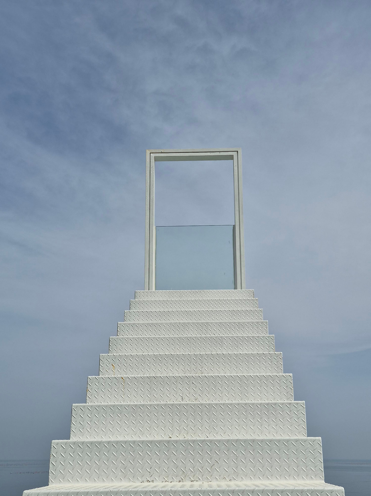 반쯤 열린 문을 통해 앞을 내다본다. 하늘엔 옅은 구름이 끼어 있고, 발아래엔 푸른 바다 그리고 파도가 넘실댄다.