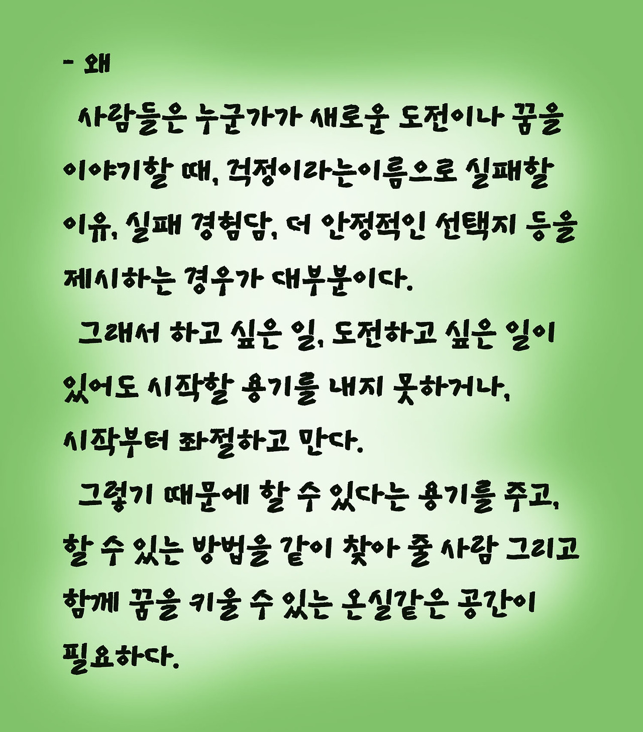 딸의 이야기를 듣고 생각했습니다. 딸이 동업을 제안했을 때, '안돼, 이렇게 경기가 안 좋은데 북카페가 되겠나?' '아빠도 자영업을 해봤는데, 그거 돈도 안되고 정말 힘들다.' '그냥 월급 따박따박 나오는 직장이나 알아보는 게 어때?'하고, 걱정이라는 이름으로 실패할 이유, 실패한 경험담, 그저 평범한 선택지를 제시하지 않은 것이 천만다행이라고.