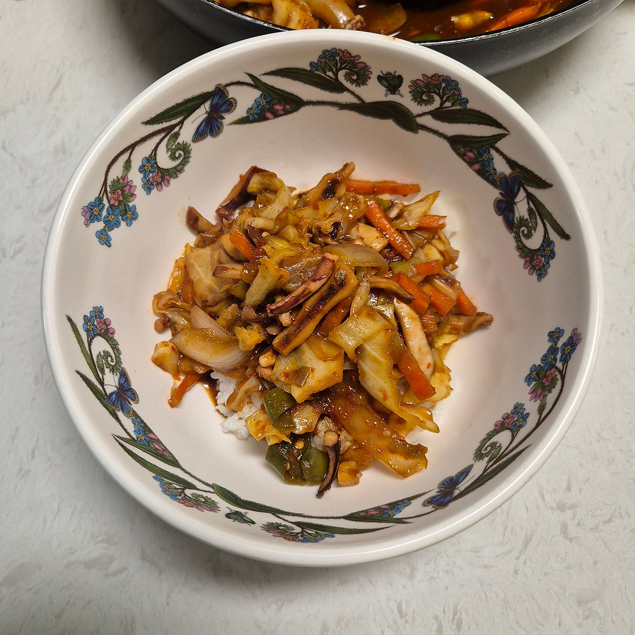따끈한 하얀 쌀밥 위에 오징어 야채볶음을 얹으면 다른 반찬 없이도 한 끼 식사로 거뜬한 오징어 덮밥이 된다.숟가락으로 쓱쓱 비벼서 한술 떠먹으니 안 그래도 요리한다고 허기진 차에 아주 꿀맛이었다.
