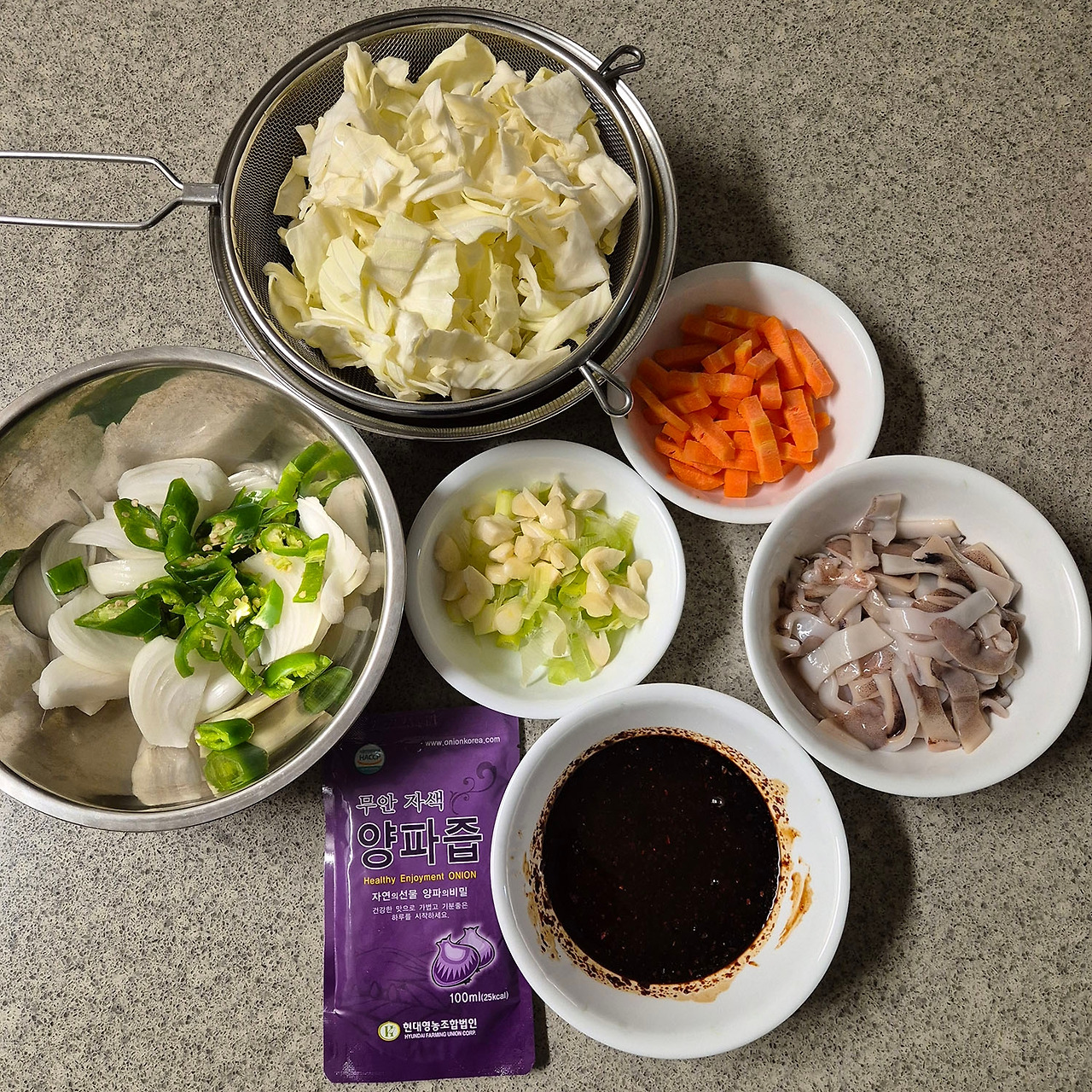 재료준비가 다 끝났으면 본격적으로 요리를 시작해 볼까? 먼저 프라이팬에 기름을 두르고 열이 오르면 파와 마늘을 넣고 살짝 볶아 파기름을 낸다. 그러고 나서 당근, 양배추, 양파, 풋고추 등 야채를 넣는다. 여기서 숨은 팁 하나. 한때 몸에 좋다고 해서 사다 놓고 먹다 남은 자색 양파즙이 눈에 띄어 한 봉지 넣었더니 국물도 넉넉하고 단맛이 우러나서 괜찮았다. 그다음 손질한 오징어와 만들어 놓은 양념장을 넣고 양배추가 숨이 죽을 정도로 볶아주면 오징어 야채볶음 완성.