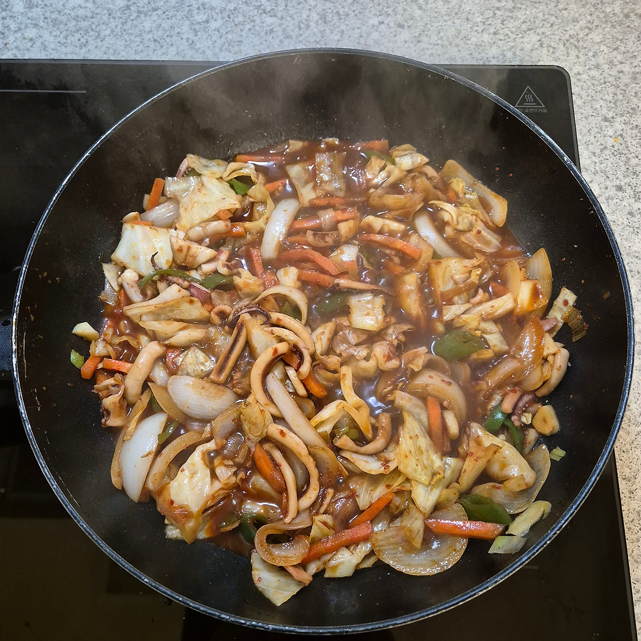 그래도 퇴직 후 집에서 이것저것 요리를 해보았다고, 손에 요령이 붙어 어지간한 것은 망설여지지가 않는다. 오징어 볶음이나 낙지볶음이나 뻔히 아는 맛에, 어떻게 어떻게 하면 되겠다는 게 머리에 그려졌다. 보자, 그러면 먼저 야채를 다듬어야겠지? 양배추, 당근, 양파, 풋고추, 파, 마늘 등 야채를 적당한 크기로 다듬고 나서, 해동된 오징어를 깨끗하게 씻어서 역시 적당한 크기로 자른다. 그다음은 양념장 만들기. 고추장, 고춧가루, 간장, 올리고당, 설탕, 굴소스 등 기본재료로 너무 맵지 않게 감으로 적당량을 섞어서 만든다. 여기서 적당량이 어떤 의미인지 주부님들은 다 아시리라 믿는다.