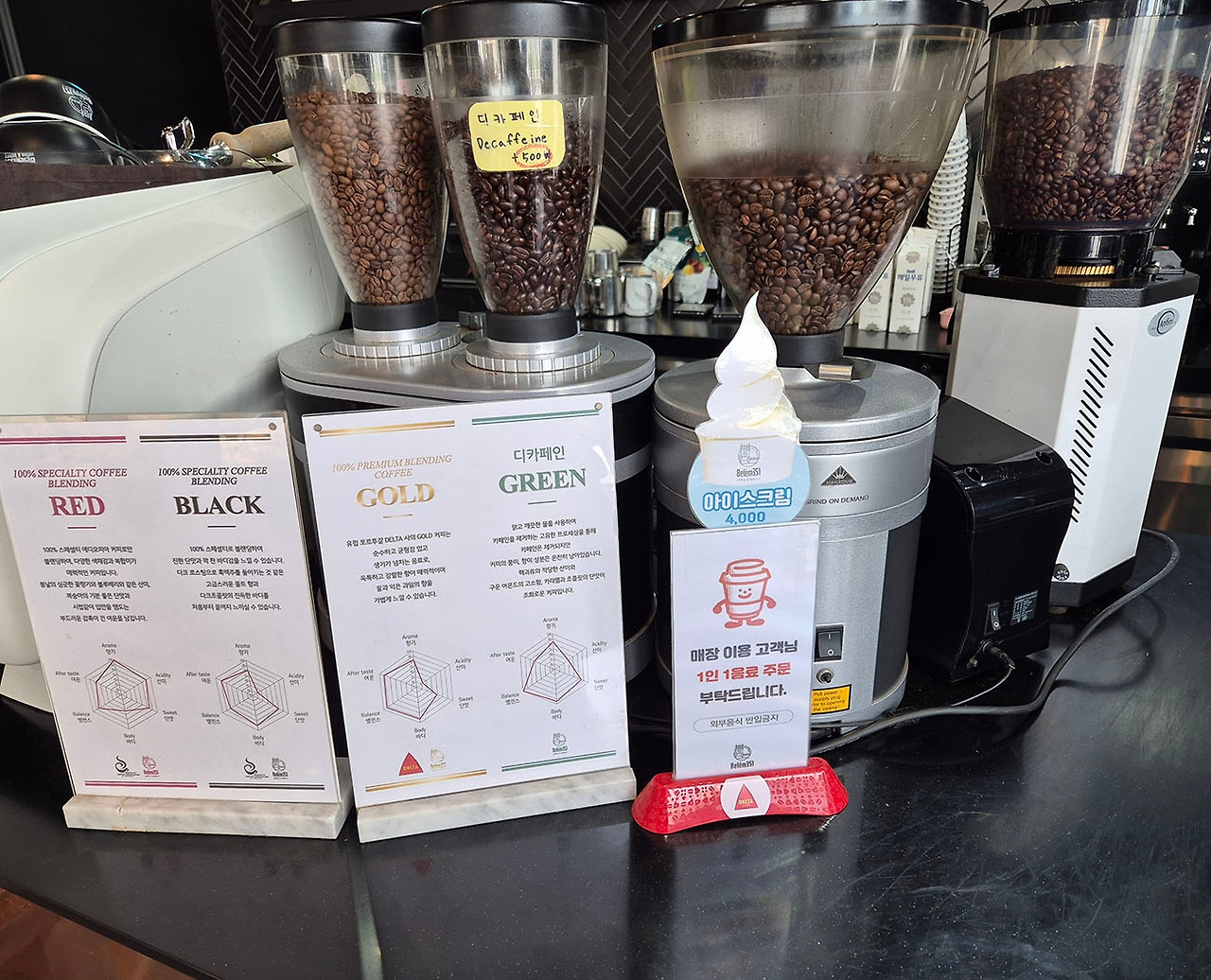다크초콜릿의 달콤 쌉싸름하면서도 무게감이 있는 커피, 산미가 살짝 느껴지면서 부드러운데 마실수록 뒷맛이 좋은 커피, 너트류의 고소한 맛이 느껴지며 부드러운 커피, 맛과 향이 부드럽고 괜찮은데 뭔가 살짝 아쉬운 커피. 그중에서 딸과 저는 첫 번째가 제일 맘에 들었습니다. 크게 호불호가 없이 사람들이 좋아할 만한 맛이었거든요. 강사님이 말하더군요. 첫 번째와 두 번째는 스페셜 원두이고 네 번째는 디카페인이라고요. 그리고 네 가지 다 직영 카페에서 팔고 있는 메뉴라고요. 직영 매장답게 네 가지 커피를 팔고 있었던 것입니다. 하지만 저희는 일반커피 한 종류와 디카페인커피를 팔 예정이므로 하나를 선택해야 합니다. 아마도 첫 번째 커피가 될 듯하네요. 물론 다른 곳에서도 찾아봐야겠지만 말입니다.
