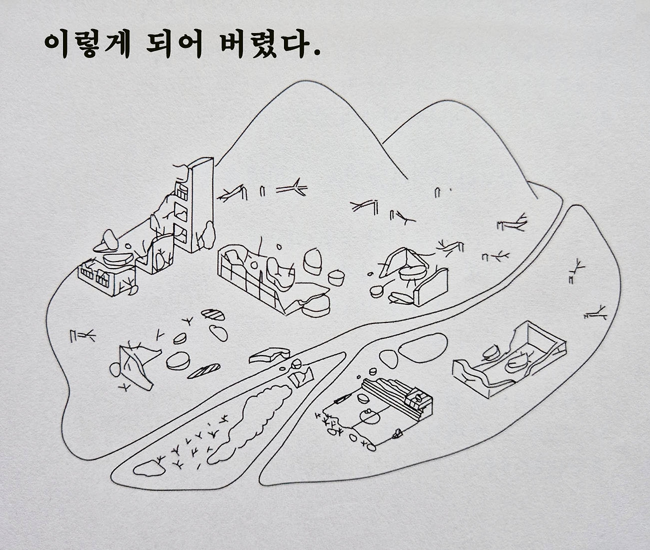 햇수로 6년째 다니던 회사는 업무도 적성에 잘 맞고 같이 일하는 사람들도 너무 좋아서 더할 나위 없이 만족스러운 곳이었다. 평생 여기서 월급 받아먹으며 지내도 괜찮겠다 싶었다. 그런데 3년이 지난 지금은 그 모든 날이 꿈이었던 것처럼 사라지고 없다. 식사 때면 내가 먹고 싶은 음식보다 아이가 먹을 수 있는 음식이나 아이가 좋아하는 음식을 먹고, 그림은 아이와 함께하는 스케치북 낙서가 다이고, 읽고 싶은 책은 뒤로한 채 육아 관련 서적을 읽고, 아이돌이 아닌 아이를 쫓아다니고 있다. 내가 알던, 내가 살던, 나의 세상은 다 사라졌다. 회사 출퇴근, 사내 메신저로 회사 욕하던 동료들, 꿀맛 같던 반차 연차, 퇴근 후 자유로운 취미생활, 내가 원하는 것들로만 채워진 하루, 이제 어디서도 찾을 수 없는 세상이다. 문득 내 삶이 폐허가 되었다고 느껴졌다.