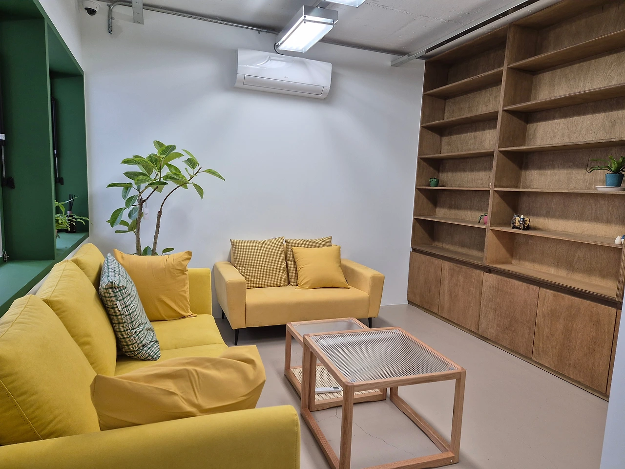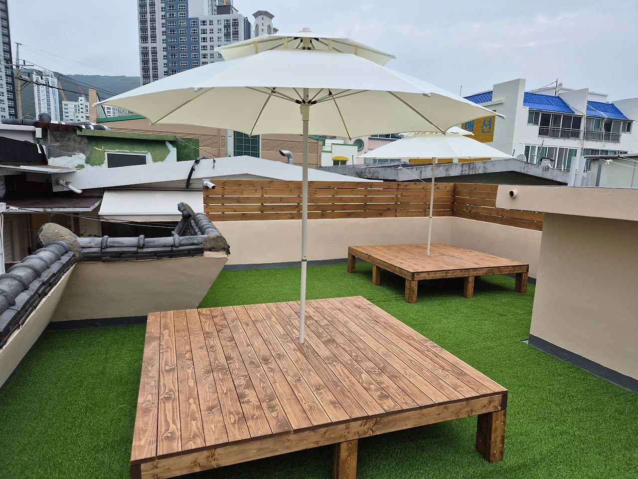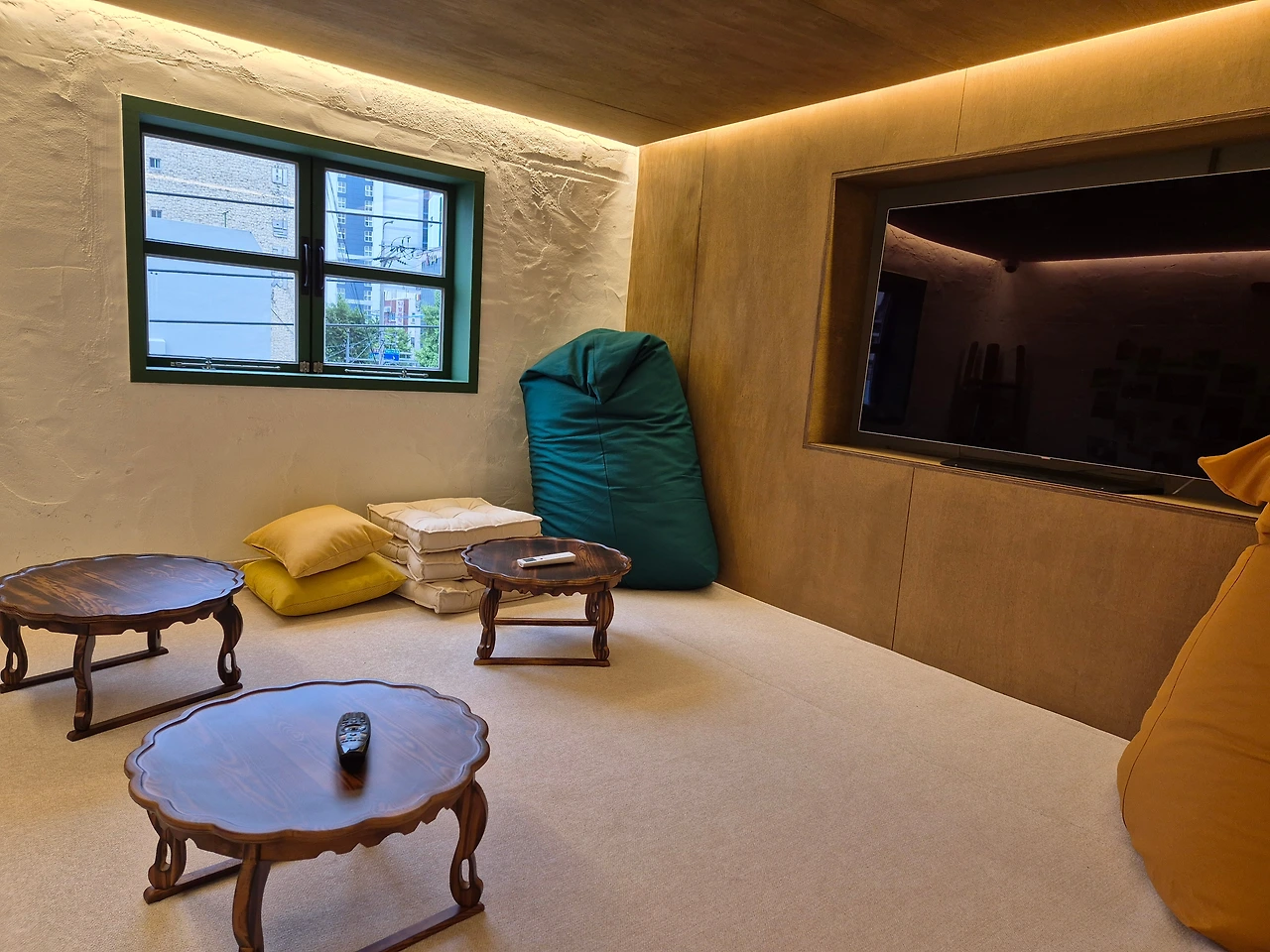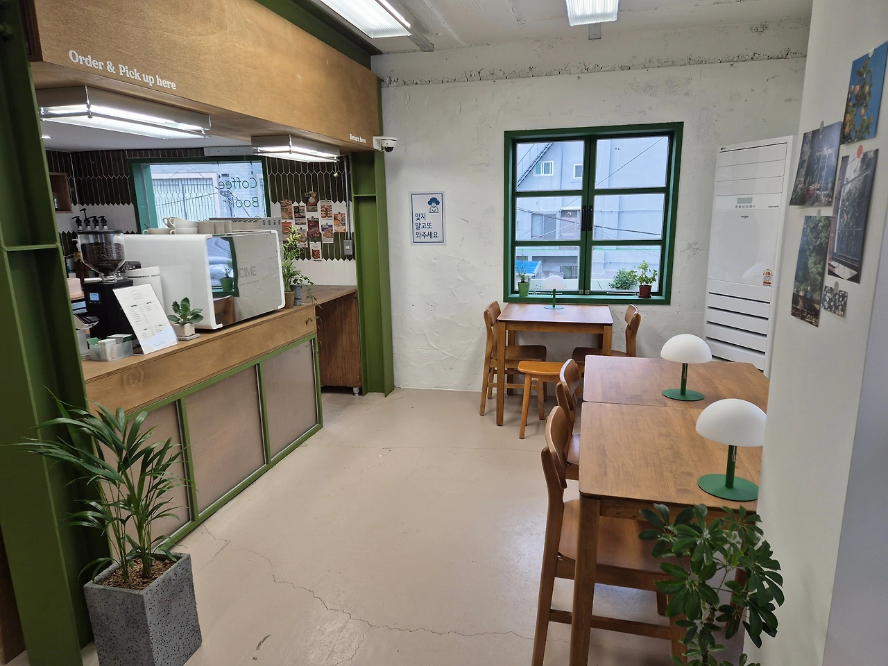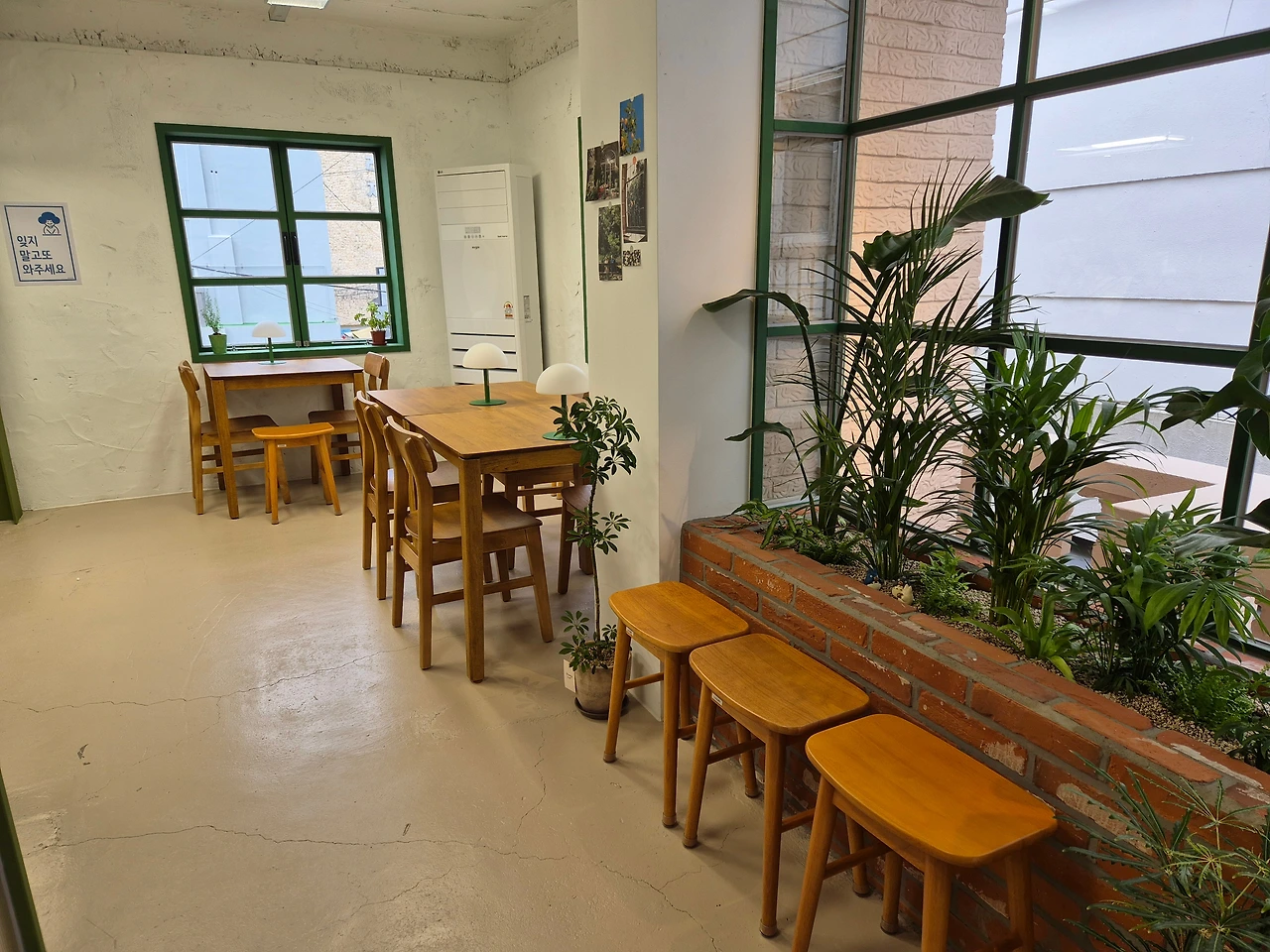 사진으로 가게 내부를 소개해드리자면, 작은 화단과 소박한 테이블이놓인 홀이 있습니다. 그 안쪽에 계산대와 커피머신이 있네요. 그리고 반대편책이 진열될 방에는 소파로 꾸며 놓았습니다. 노란 원색입니다. 사진으로도 텅 빈 책장이 영 아쉽습니다. 아늑한 아지트 같은 다락방은 자유분방한 모습입니다. 아무렇게나 놓여 있는 밥상이 생뚱맞습니다. 티브이 화면으로는 불멍이나 폭포수 떨어지는 것을 볼 것이라 하네요. 옥상에는 평상 두 개를 펼쳐 놓았습니다. 바람 솔솔 부는 저녁, 역시 멍 때리기 좋은 장소입니다.