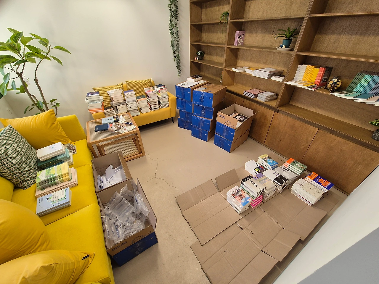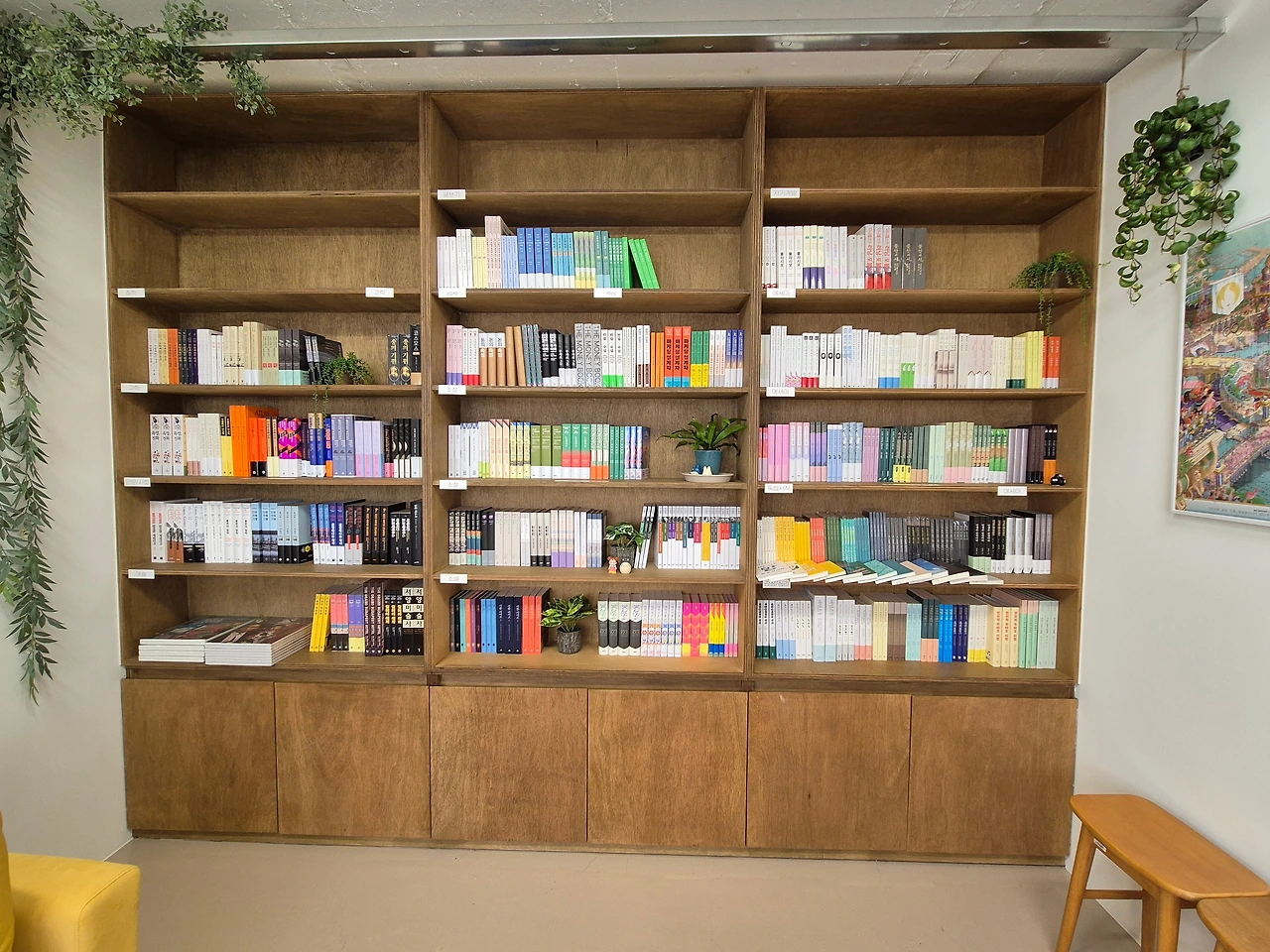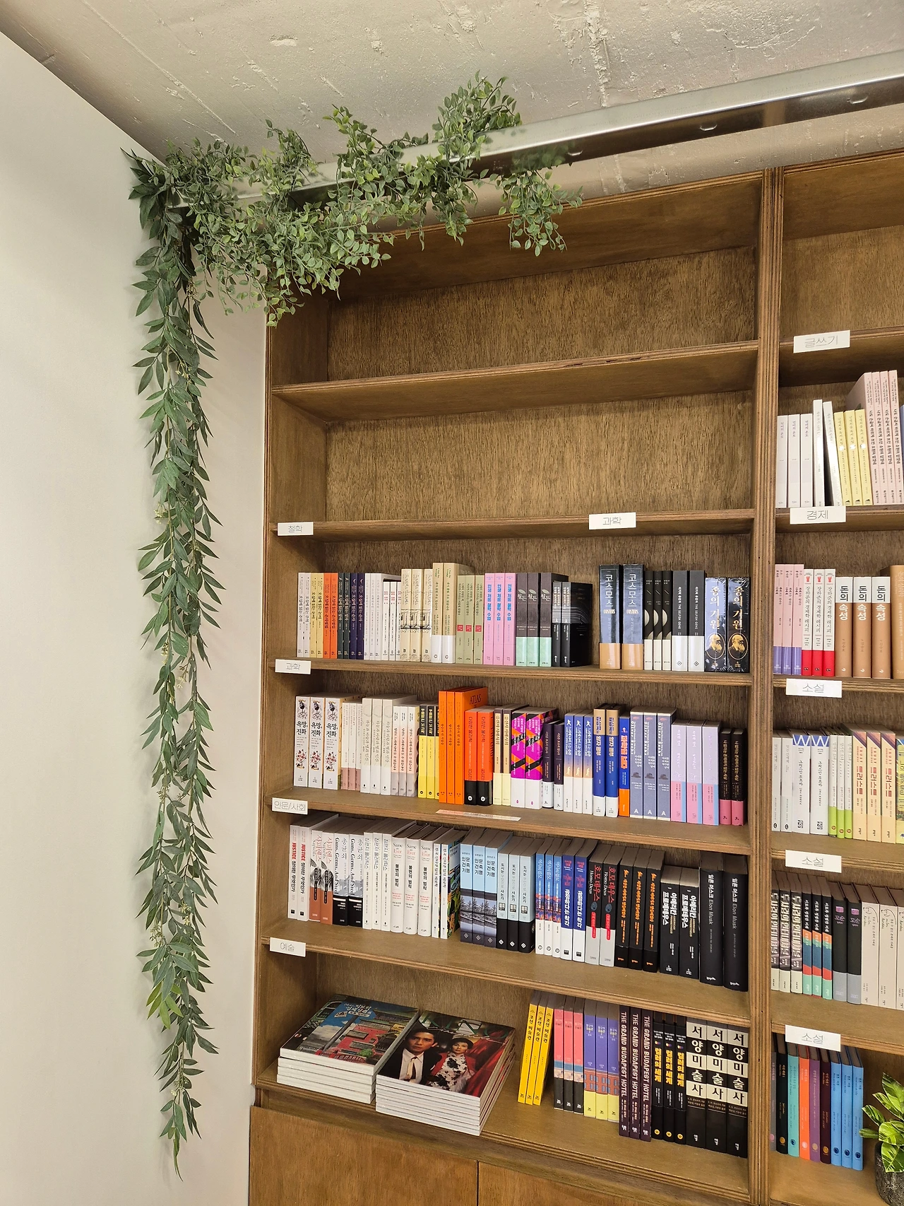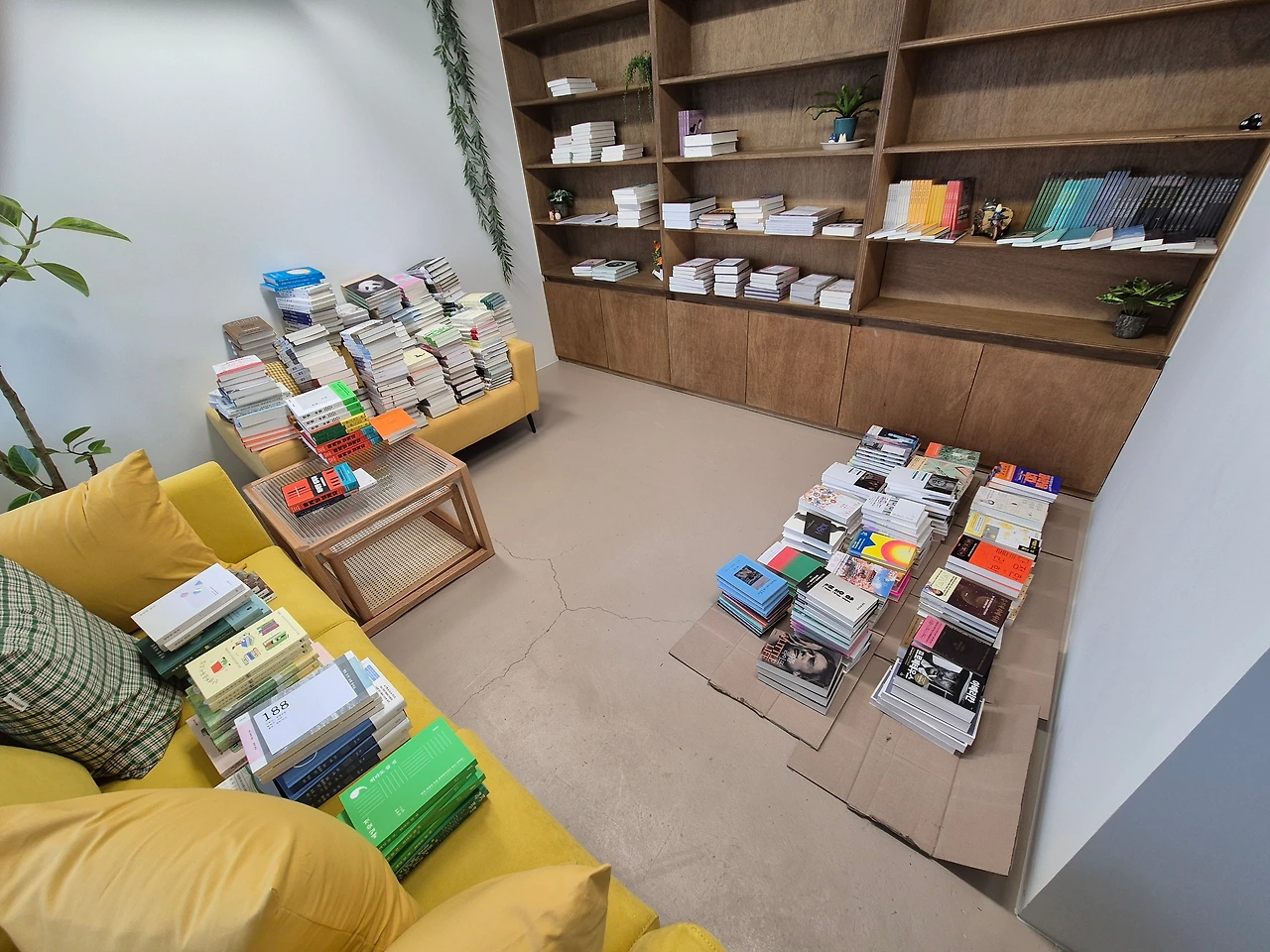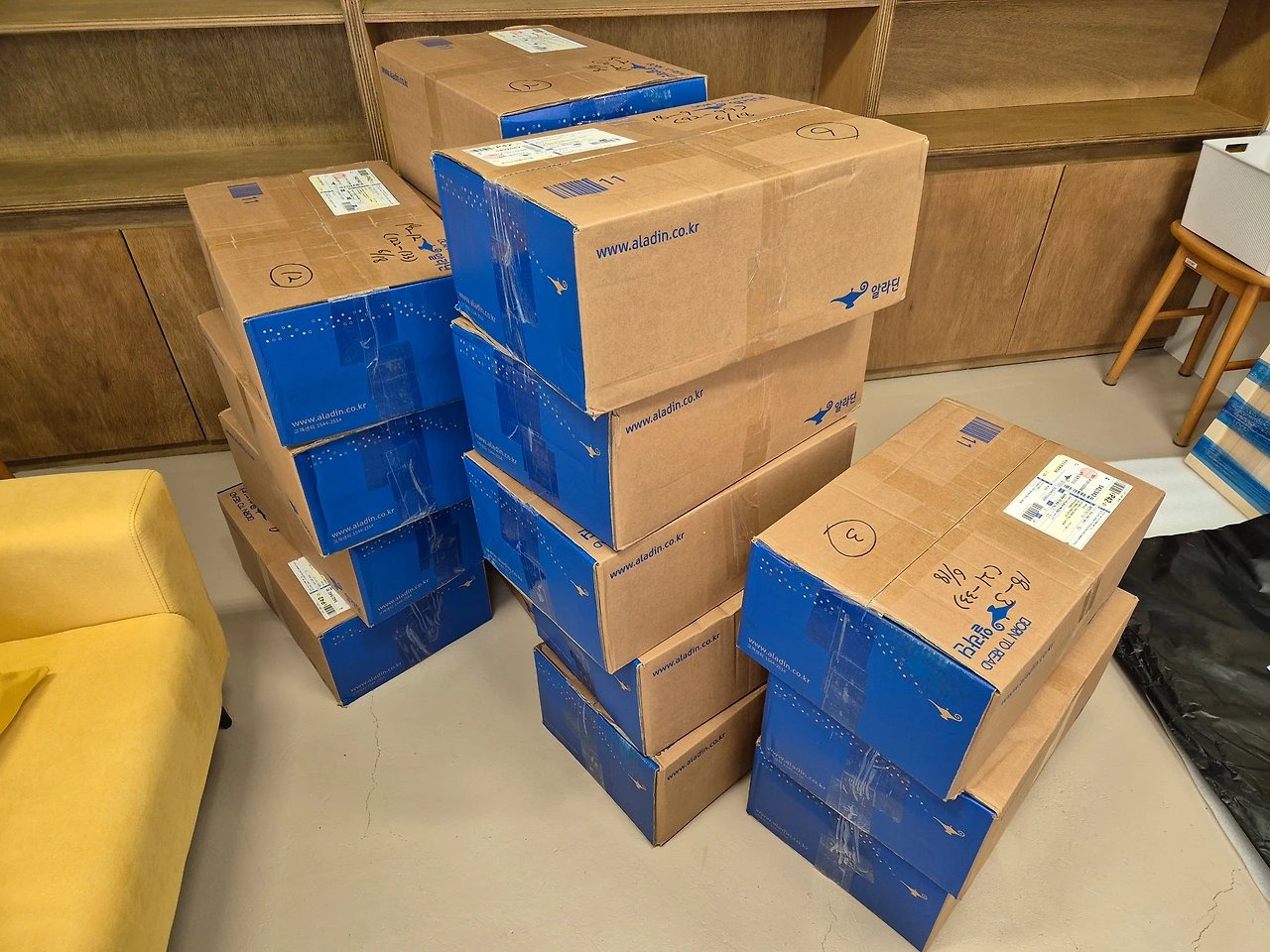 실내에 조화 장식을 마치고 이번엔 배달된 책 정리에 들어갔습니다. 네, 그렇습니다. 책 없는 책방을 가오픈하였는데, 그다음 날 알라딘에서 책이 배달되었습니다. 열 일곱 상자. 그전에 다른 곳에서 들어온 독립서적은 빼고 말입니다. 딸과 함께 박스를 열고 책을 꺼내 입고리스트에 체크하고 나서, 소설, 에세이, 과학, 예술, 글쓰기 등 딸이 나름대로 정해놓은 분류 기준대로 나누어 놓습니다. 그런데 책이 좀 무겁습니까? 시간이 지나니 손목이 아프더군요. 마음 건강을 튼튼하게 해주는 책이 사실은 육체운동도 시켜준다는 사실을 새롭게 알았습니다. 택배 기사님을 도와 박스 몇 개를 옮겼는데, 두 박스 들고 계단을 오르니 다리가 휘청거리더군요. 택배 기사님이 박스 세 개를 짊어지고 오르며, "두 개 들지 마세요, 허리 다칩니다." 하고 저보고 걱정을 하더군요. 자기는 세 개를 짊어지고서 말이죠. 함께 일하는 아내로 보이는 듯한 여성분이, "자기도 무리하지 마!" 하고 걱정스러운 눈으로 쳐다보는데, 제가 괜히 미안한 생각이 들었습니다.