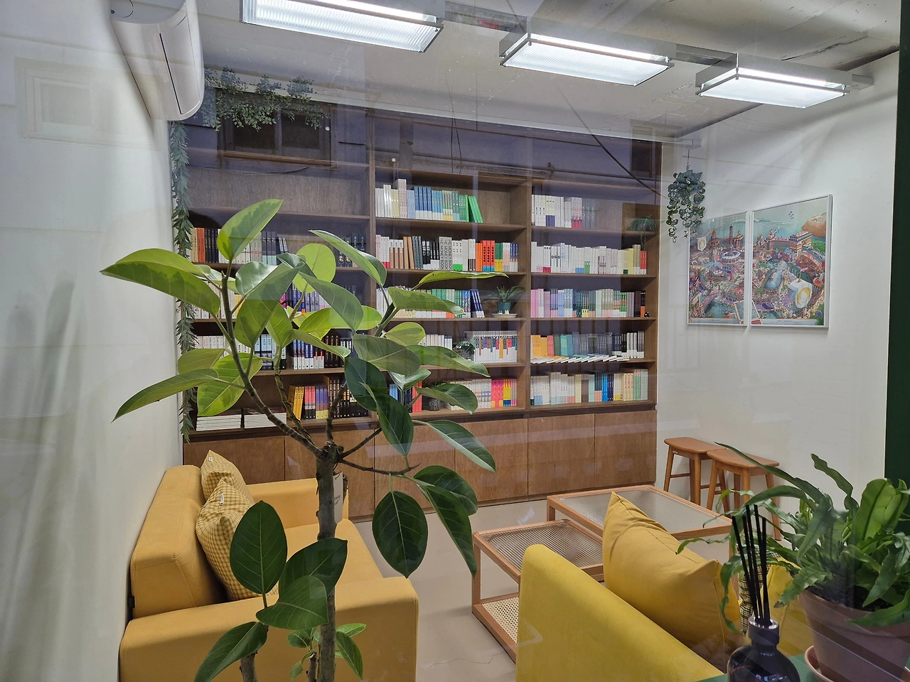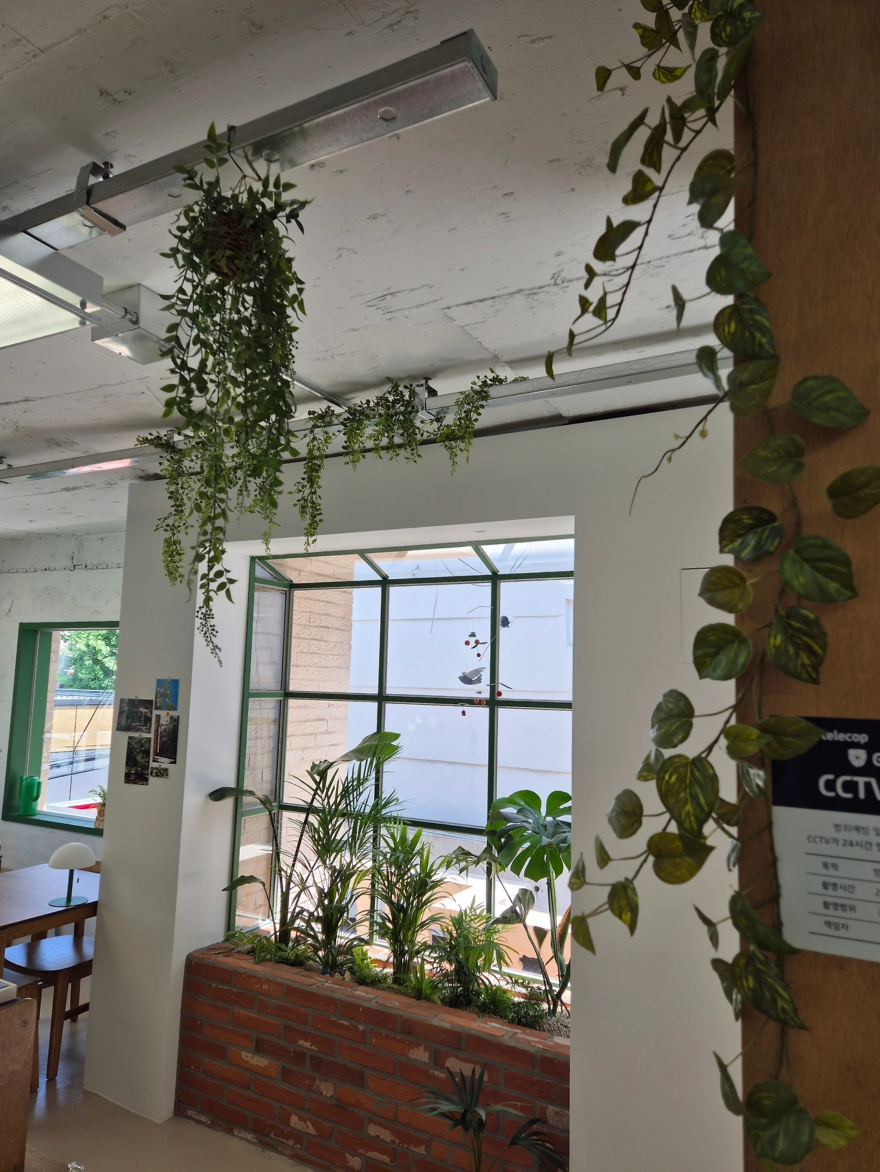 가게이름이 '책방온실'인데, 온실이라 하기에는 식물이 턱없이 부족한 것 같습니다. 가장 큰 사유는 돈 문제입니다. 처음에 조경 전문가에게 의뢰하였는데, 예상을 훌쩍 뛰어넘는 견적이 들어왔습니다. 이건 아니다 싶었죠. 그다음 사유는 관리 문제입니다. 많은 종류의 식물을 주기에 맞추어 물 주고 보살펴야 합니다. 일일이 손이 가야 하는 일이죠. 그랬다간 책방이 먼저인지 온실이 먼저인지 길을 잃을 수 있습니다. 제가 보기에는 그랬죠. 그래서 '일단 꼭 필요한 부분만 먼저 하고 운영하면서 아쉬운 부분을 채워나가자' 하고 딸을 달랬습니다. 그렇게 해서 실내의 작은 화단과 입구 조경만 전문가에게 맡겼습니다.