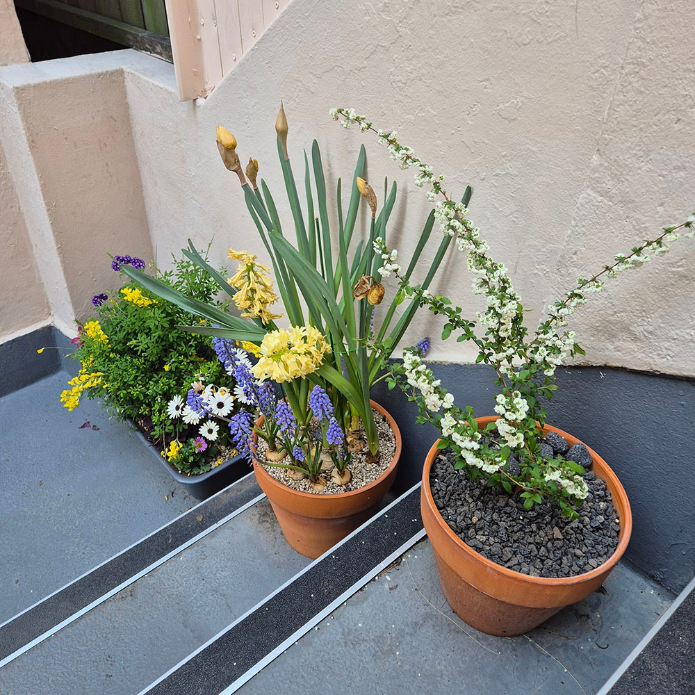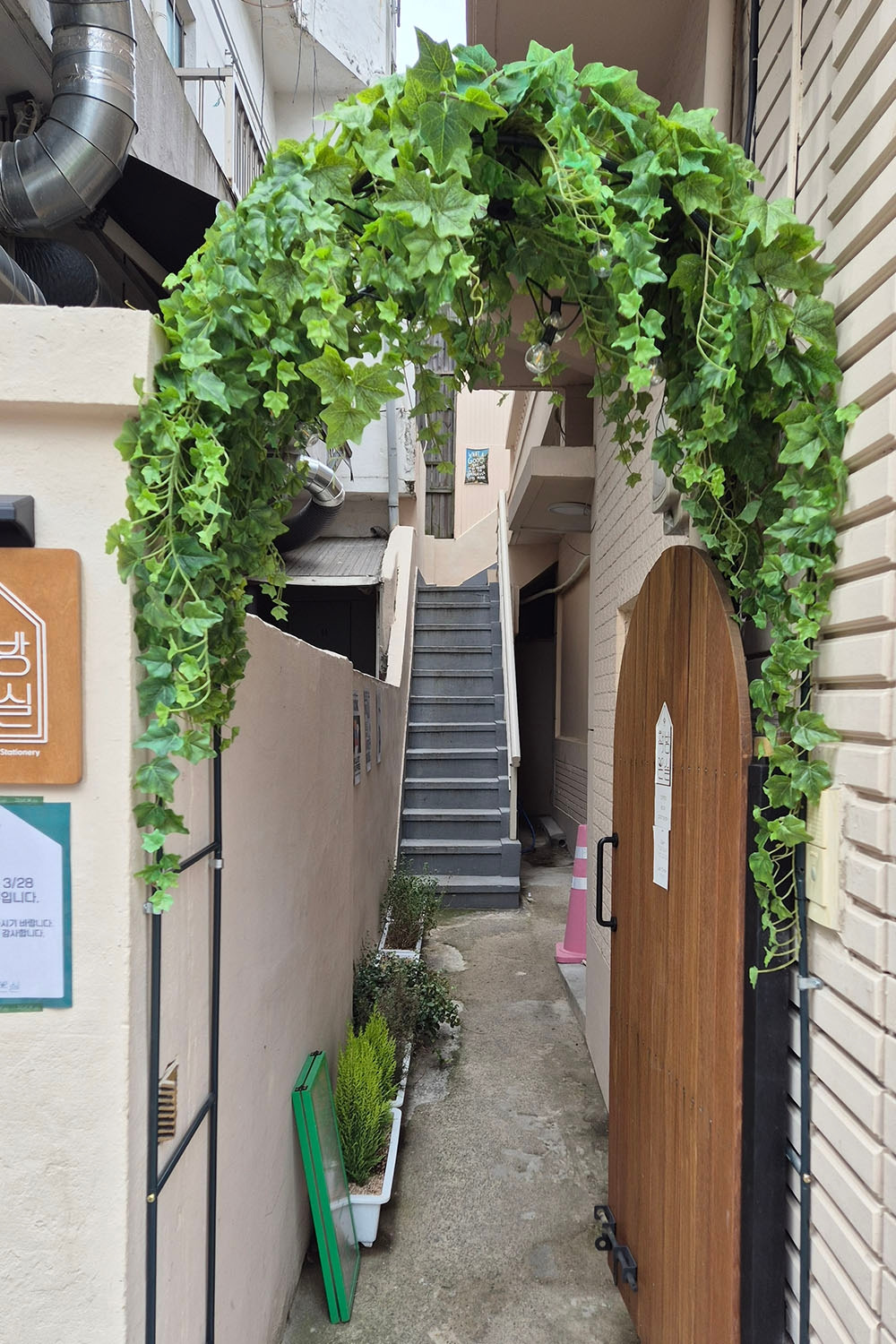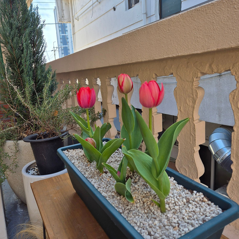 뭔가 허전하고 삭막했던 1층 출입구 윗부분에 담쟁이덩굴을 올렸습니다. 꼬마전구를 달아 놓으니 밤에 불이 들어오네요. 덩굴식물이 벽 타고 오르게 클립을 붙여주고, 화훼농장에서 화분과 꽃모종을 사가지고 와 계단과 현관문 앞에 꽃장식도 했습니다. 작년 겨울에 사장님이 심어 놓은 튤립도 빨간 꽃을 예쁘게 피워 놓았네요. 그렇게 화사하게 꾸며 놓으니 마음이 한결 가벼워지는 느낌입니다.