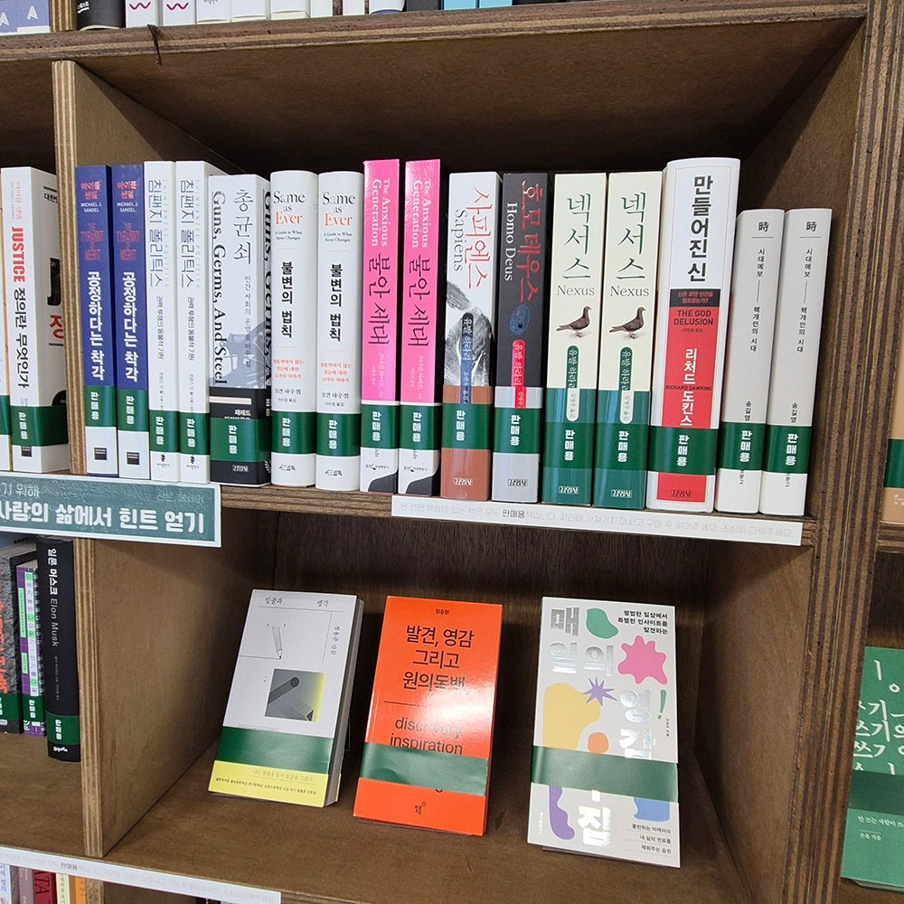저희 가게에는 판매용 책과 열람용 책이 구분되어 있습니다. 큰 책장에는 판매용 책이 진열되어 있는데, 개중에 판매용 책을 자리로 가져가서 읽는 손님들이 있습니다. 책장 곳곳에 주의사항을 적어 놓았는데, 몰랐다고 하네요. 심지어는 읽던 곳을 접어놓아 아예 팔지 못하게 만들어 버리는 경우도 있습니다. 정말 속상한 일이죠. 사장님의 고민이 깊어집니다. 계속 손님들 따라다니며 감시할 수도 없고 말입니다. 그러다 결국 사장님이 결단을 내립니다. 모든 판매용 책에 '판매용' 띠를 두르기로요. 그렇게 해서 판매용 책들이 모두 초록색 허리띠를 두르게 되었습니다. 앞으로는 손님들께서 책을 조심스럽게 다뤄주시면 좋겠습니다.