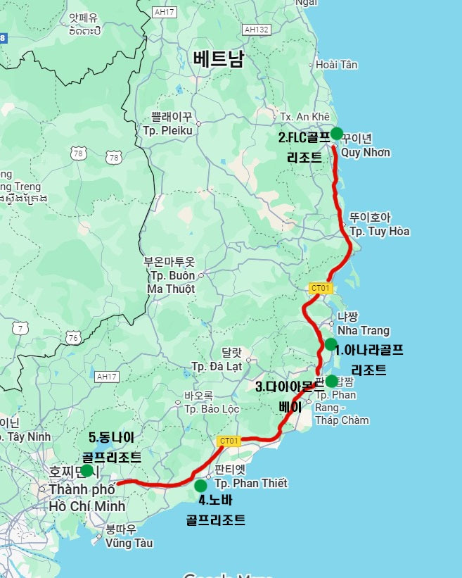 이번 골프여행 여정은 아래와 같다. 호치민에서 출발하여, 냐짱을 거쳐 뀌년에 갔다가 다시 냐짱을 거쳐 판티엣과 동나이를 돌아 다시 호치민으로 복귀하는 코스이다. 오전에 공치고 오후에 이동하고. 골프에 충실한 여행이지만 골프보다는 마음 맞는 지인들과 함께하는 여행이라 더 즐거웠다.