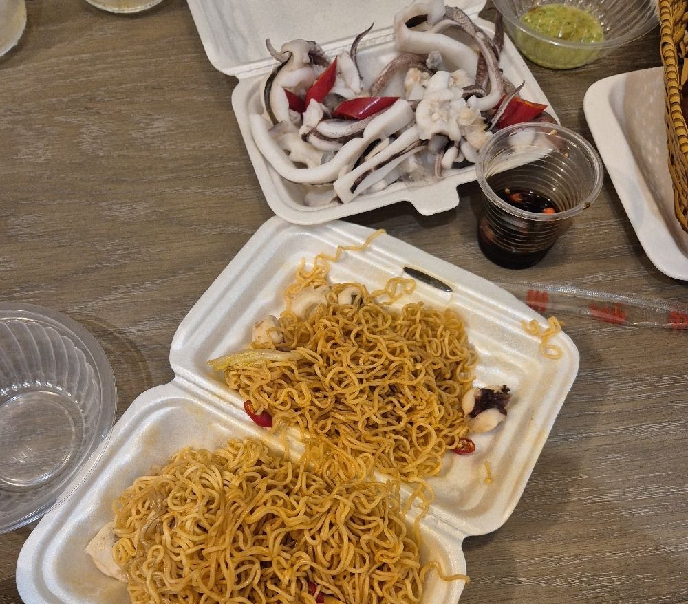 각자 배정된 빌라에 짐을 넣어 두고 김사장님 부부가 묵는 빌라로 다 모였다. 그리고 그곳으로 음식이 배달되었다. 한참 허기진 상태에서 기대하고 뚜껑을 열어보니, 어허! 볶음밥 대신 볶음면이 들어 있었다. 화면에서 메뉴를 잘못 보고 밥대신 면을 시켰던 것이다. 게다가 면에도 오징어가 잔뜩 들어있었다. 그런 줄 알았으면 오징어 요리를 별도로 시키는 게 아닌데 싶었다. 그럼에도 불구하고 보기와 달리 맛이 있었다. 볶음면도 맛있고, 오징어도 전혀 질기지 않고 부드러웠다. 사실은 오징어가 아닌 한치였던 것이다. 다들 술도 한잔 하면서 주린 배를 양껏 채웠다. 사람이 여덟 명이나 모이니 이런저런 이야기로 시간 가는 줄도 몰랐다.