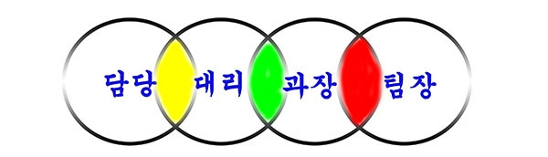 반면에 여전히 담당-대리-과장-팀장 등으로 이어지는 결재라인이 존재한다면, 아래 그림처럼 각 팀원들의 직무가 중첩되고 비효율적으로 운영되고 있다고 할 수 있다. MECE의 B 그림과 유사한 모습이다.대리와 과장의 직무가 담당자나 팀장과 어떻게 다른지, 중복되지나 않는지 따져봐야 한다. 혹시라도 분명하고 명쾌하게 구분되어 설명되지 않는다면 잘못된 것이다.