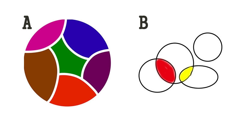 논리적 사고의 개념으로 MECE(Mutually Exclusive Collectively Exhaustive)라는 게 있다. 어떤 집단 내 항목들이 상호 배타적이면서 모였을 때는 완전히 전체를 이루는 것을 의미하는데, '겹치지 않으면서 빠짐없이 나눈 것'이라 할 수 있다. 아래 그림에서 보면 A 그림과 같은 모습이다. 반면에 B 그림은 도형 간에 교집합이 있고 동떨어진 도형이 존재한다.