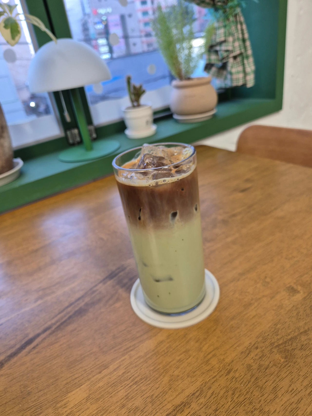나사 풀린듯한 머리도 조일 겸 시원한 말샷추 한잔 내려 창가 자리로 간다. 말샷추는 판매용 메뉴에 없지만, 가끔 만들어 먹는다. 북카페 점원의 특전이랄까. 오로지 나만을 위한 음료이다. 말차라테에 에스프레소 한잔을 얹으면, 말차 특유의 비릿하고 텁텁함이 사라진다. 게다가 말차의 쌉쌀함, 커피의 쓴맛 그리고 우유의 고소함이 절묘하게 어우러져, 그럴듯한 음료가 만들어진다.