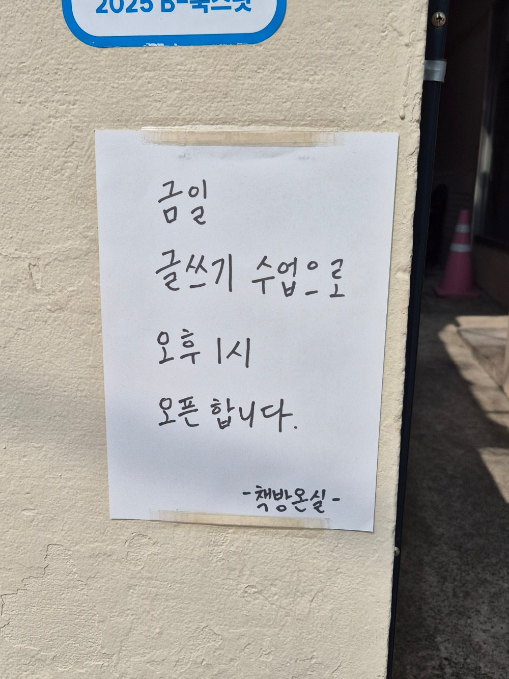 글쓰기 모임도 오늘이 마지막. 오픈 준비 끝내고 나서 일층 입구로 가 안내문 붙이고 입간판으로 입구 봉쇄. 잽싸게 올라와 홀 창가 자리에 노트북 펼치고 심호흡을 해본다.