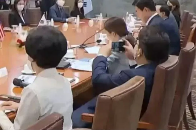 비상식적인 문자를 주고받는 것을 들키더니 이젠 대놓고 외국 하원의장과의 공식 회담 자리에서 의자에 비스듬히 기대어 핸드폰을 쳐들고 상대방을 찍는다. 결례도 그런 결례는 없다. 3류 회사에서도 그런 짓은 안 한다.