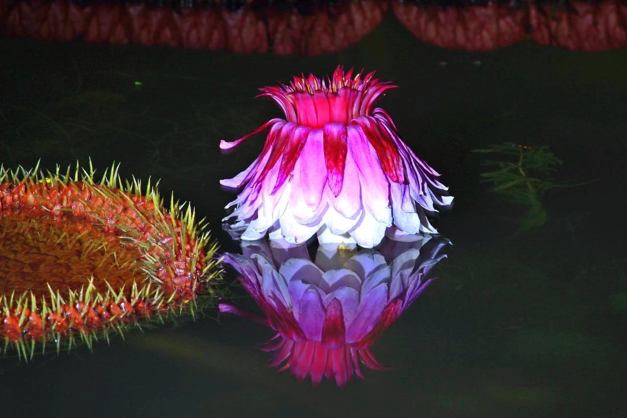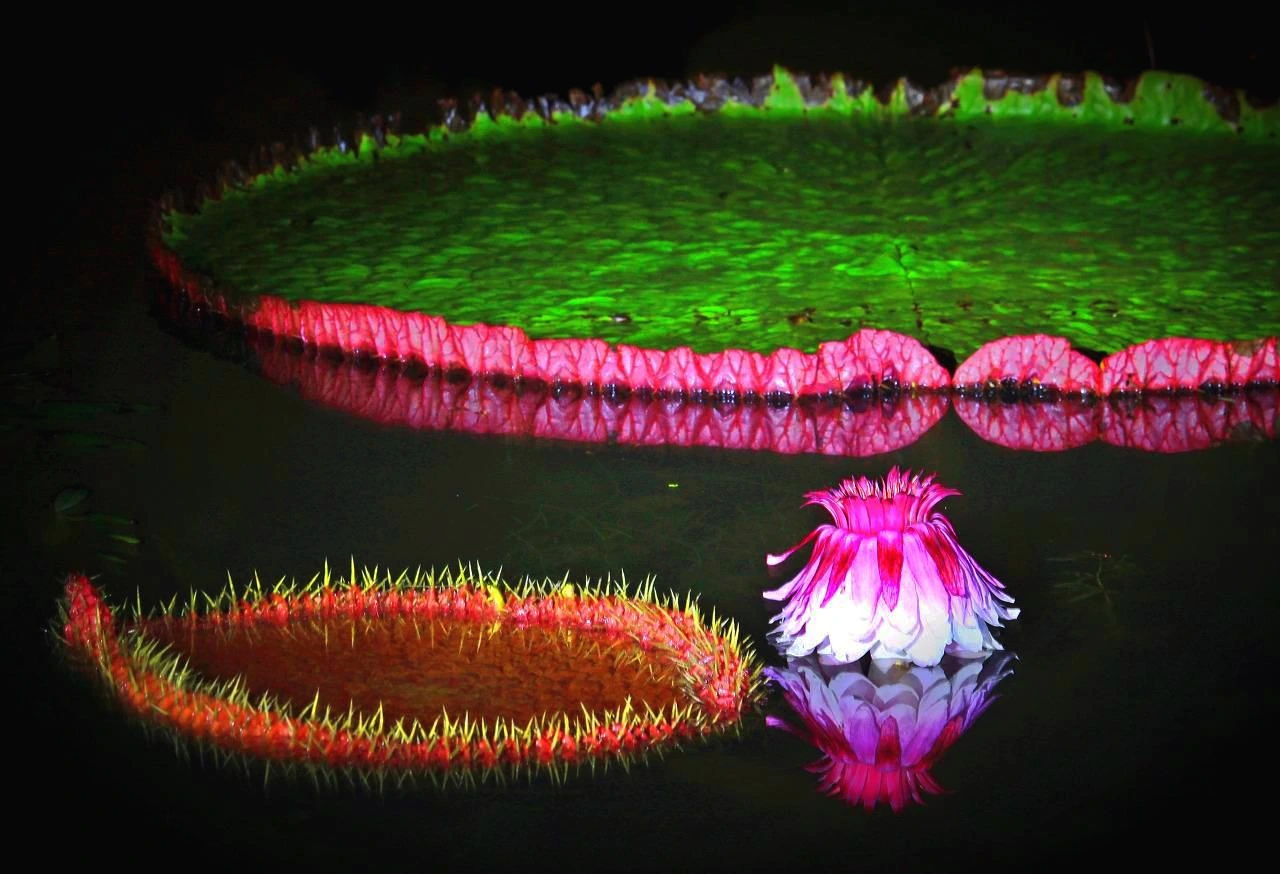 빅토리아 연꽃은 우리가 흔히 보던 연꽃과는 달리 연꽃 중에 가장 큰 잎으로 쟁반처럼 물 위에 떠 있는데 밤에만 핀다. 그러나 좀처럼 만나기 어려운 도도한 꽃.