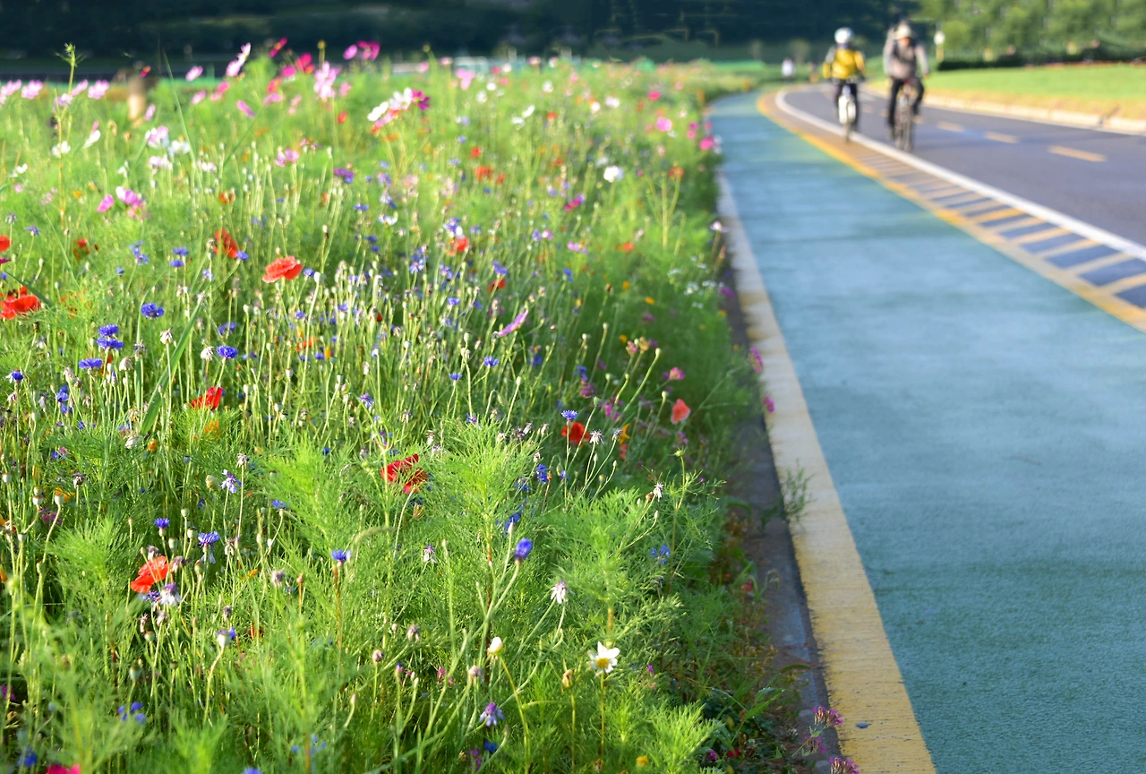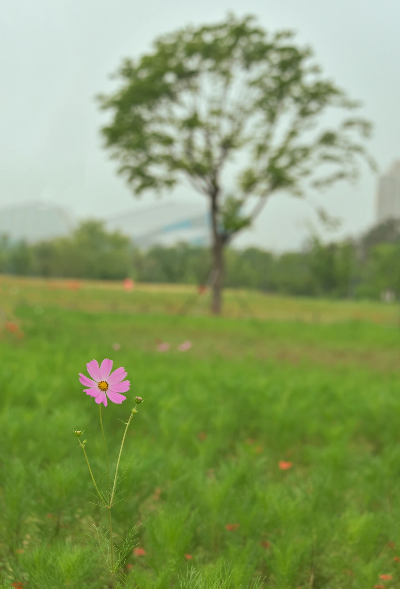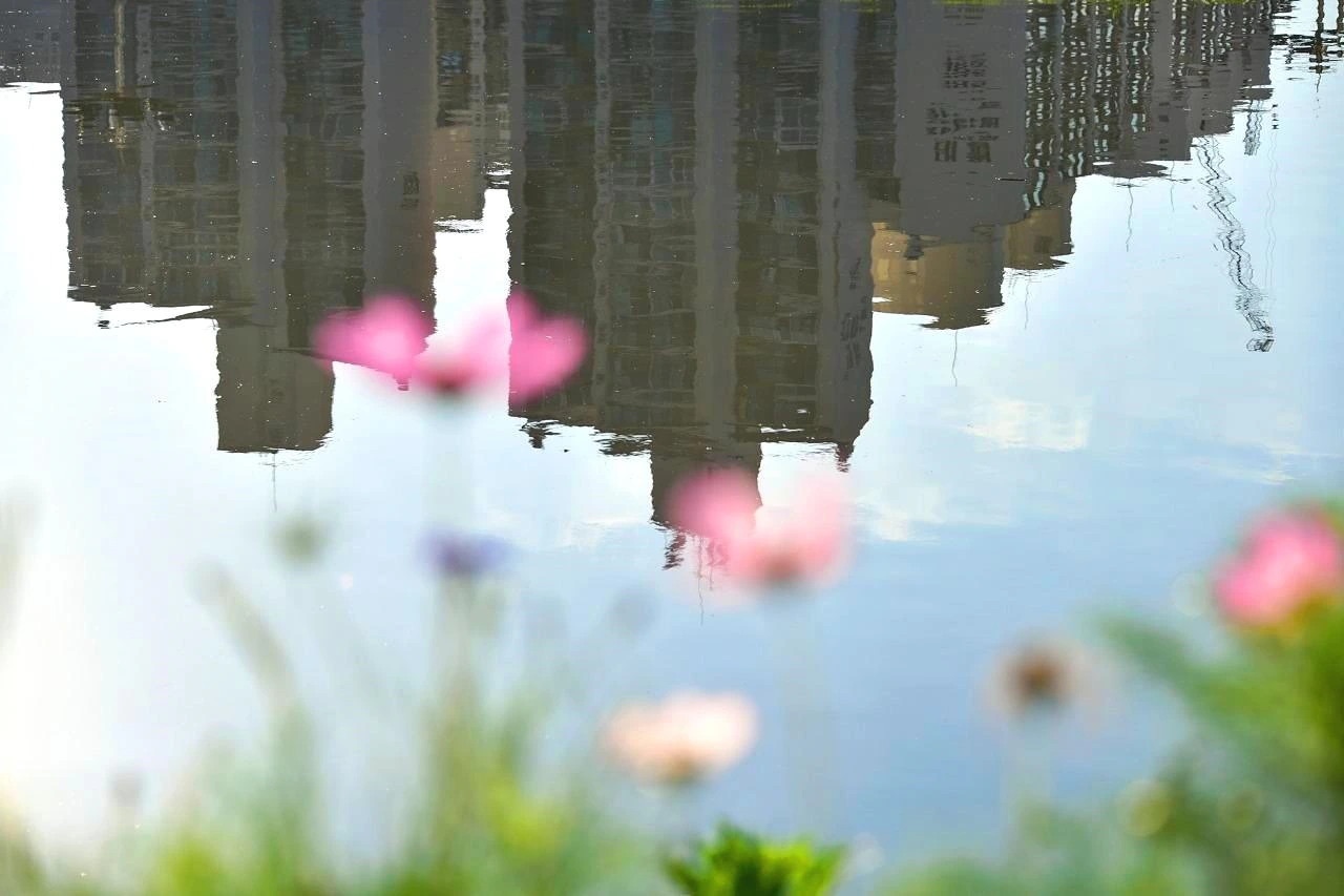 아파트와 빌딩, 코스모스와 흰구름이 함께 한다.