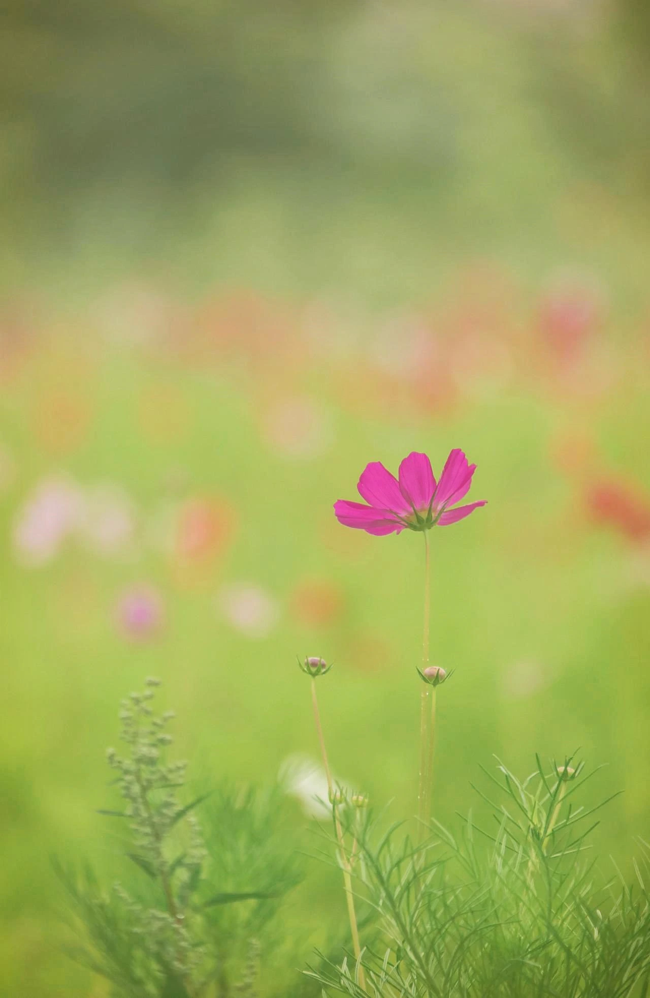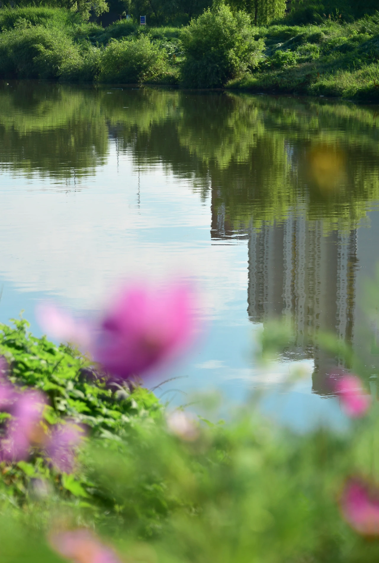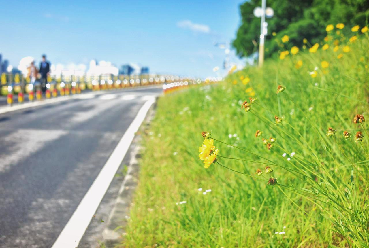 아파트와 빌딩, 코스모스와 흰구름이 함께 한다.