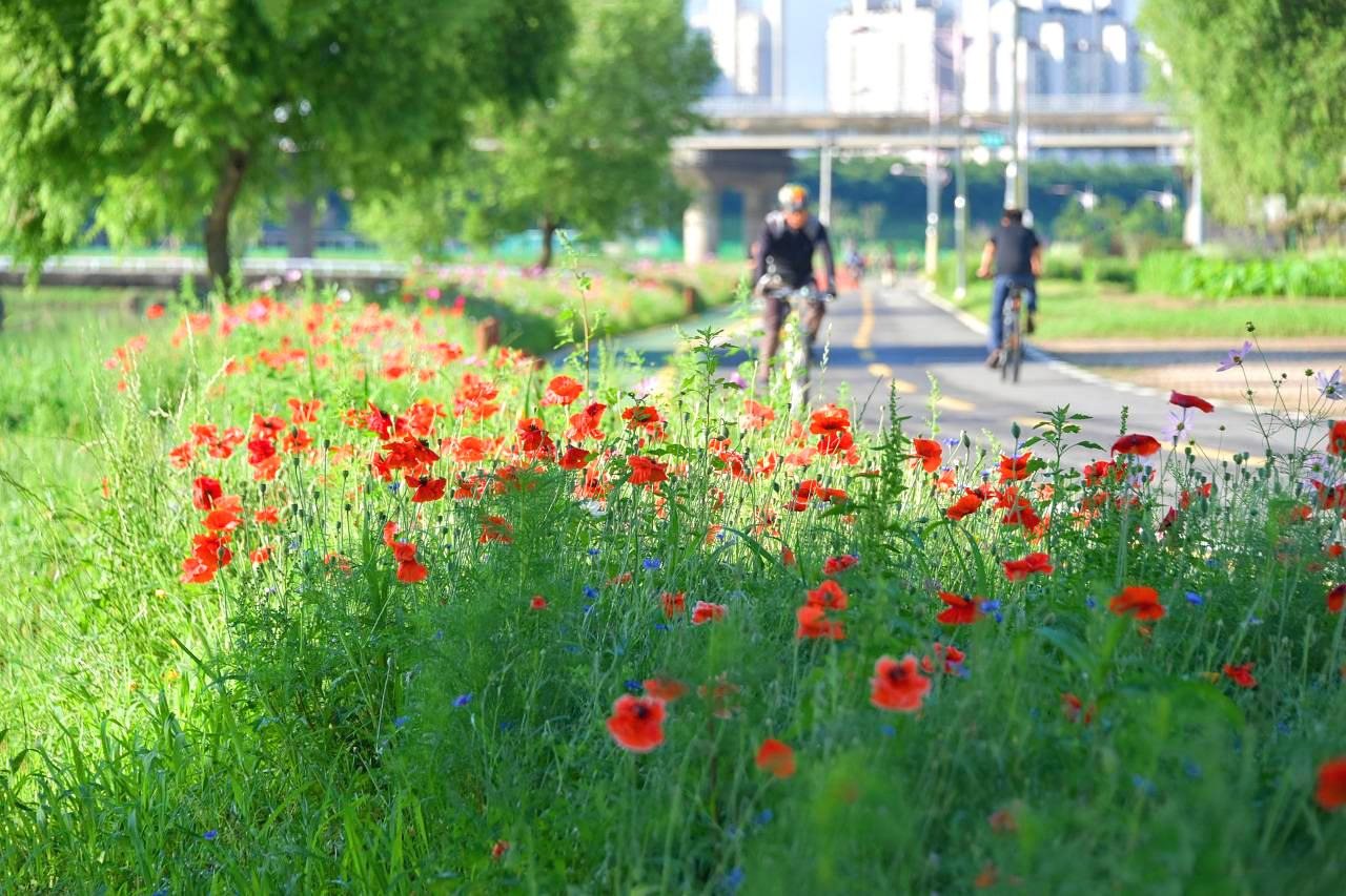 안양천변에 운동하는 사람들이 하나둘씩 나타나기 시작한다.