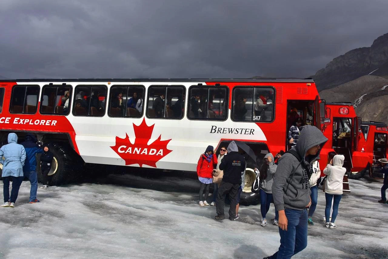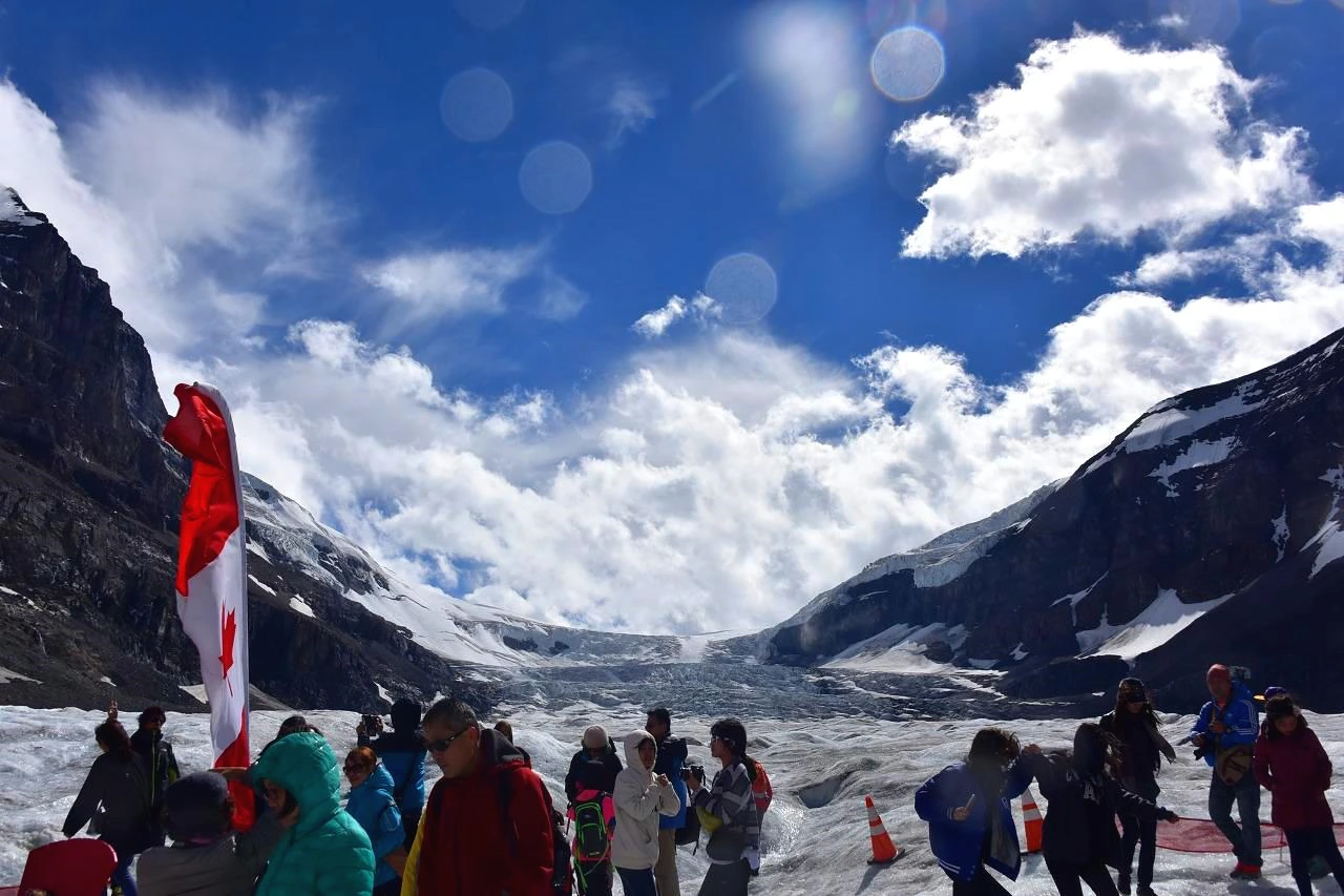 설상차를 타고 빙하에 다가가니 빨간 단풍잎의 캐나다 국기가 펄럭이고 있다.