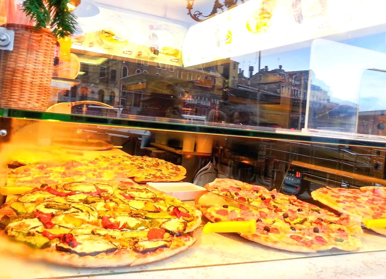 그중에서 내가 홀릭했던 피자는 토핑으로 큼직한 채소가 푸짐하고 널찍하게 올려져 있는 피자였다. 무엇보다도 채소의 단 맛이 풍부하다. 지중해의 태양을 받고 자란 가지. 호박. 파프리카 등이 잔뜩 올려져 있는데 한 조각만 사도 내 얼굴을 덮는 크기여서 아쉬움 없이 흡족하다. 조각피자는 베네치아에서 수상버스에서 오르내릴 때마다 사 먹기도 했는데 밀라노에서는 편하게 자리 잡고 앉아서 먹을 수 있어서 남편과 둘이 한 판 시켜놓고 간신히 다 먹었다.