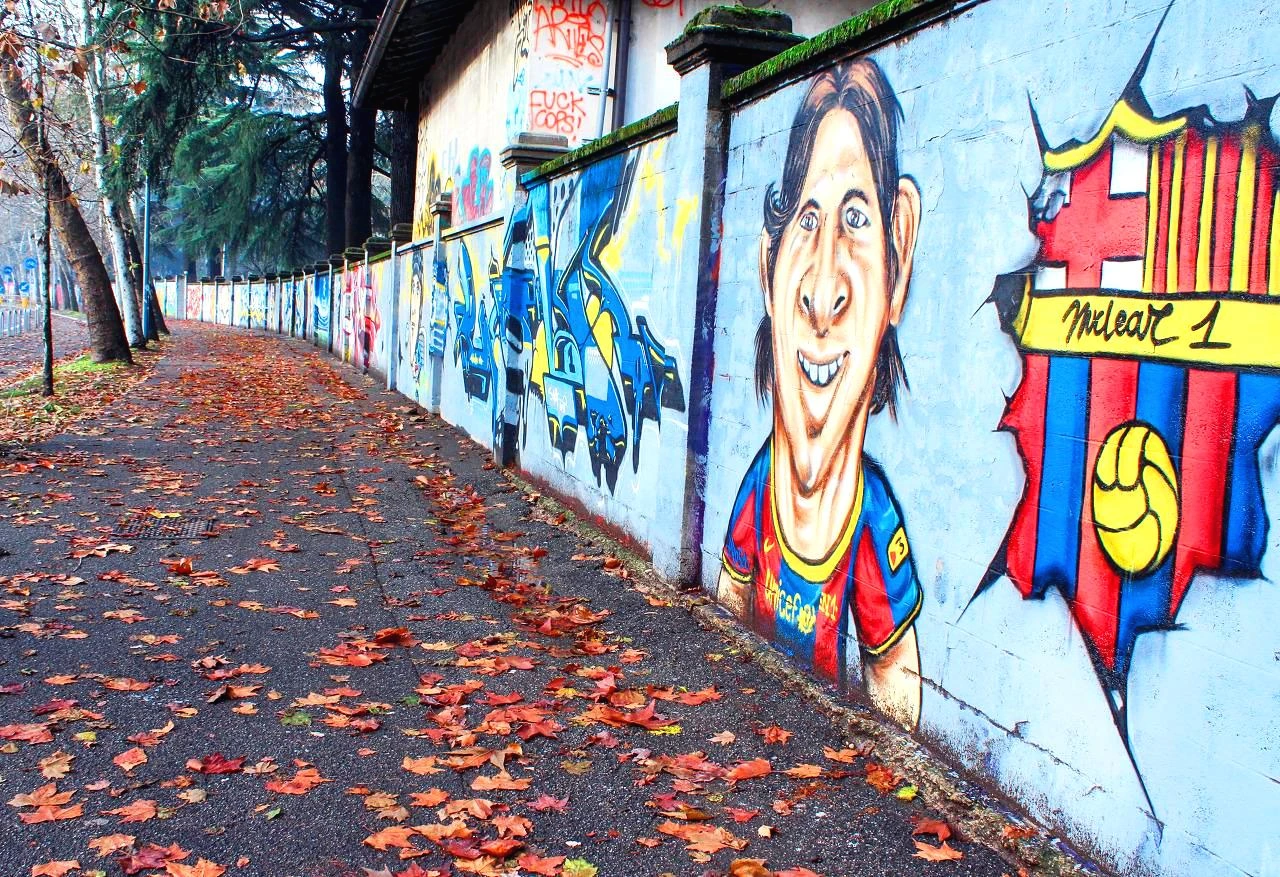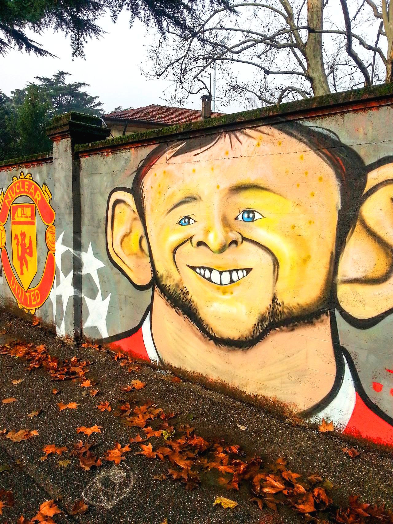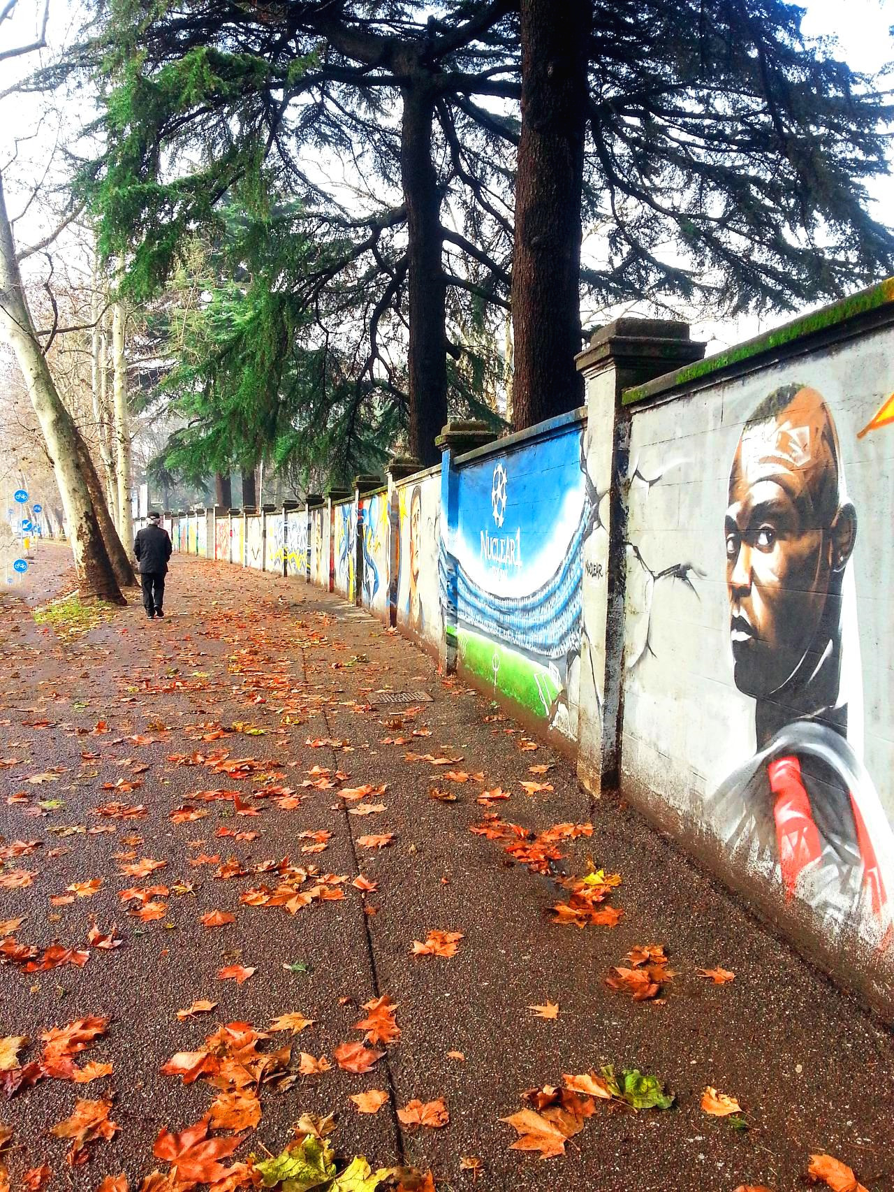 낙엽이 날리는 길 옆의 담벼락에는 AC밀란과 인터밀란의 선수들이 한 명 한 명 쭈욱 이어져서 그려져 있다. 그라피티 아트라고 하면 무조건 낙서처럼 생각해 오던 것이 거리의 예술로 자리 잡고 있듯이 경기장을 향하는 길에 이렇게 선수들의 모습을 볼 수 있다. 루니, 메시, 체흐, 발로텔리...(선수 이름은 아들이 알려주었음)
