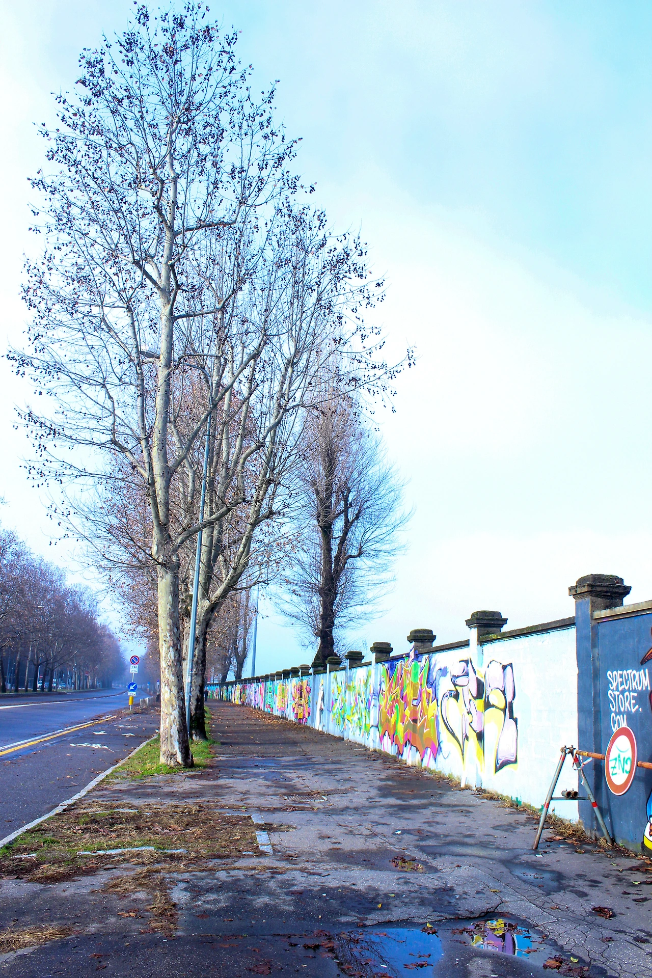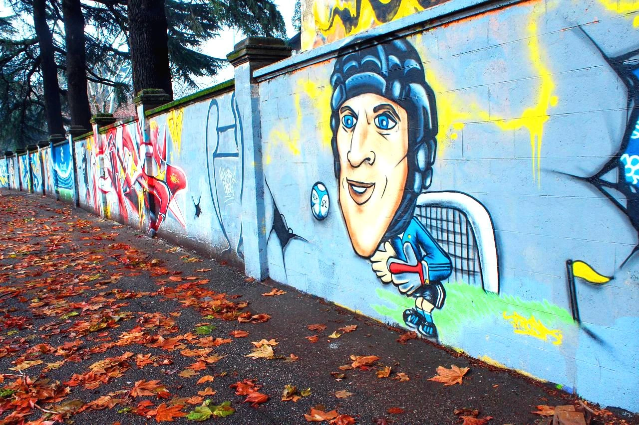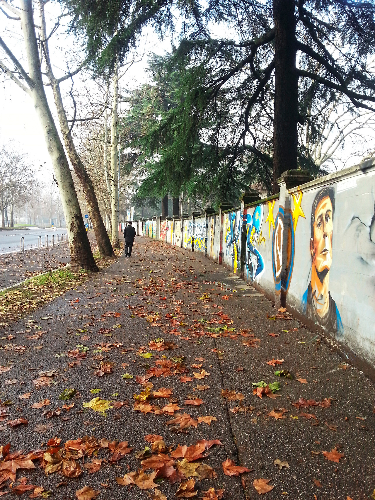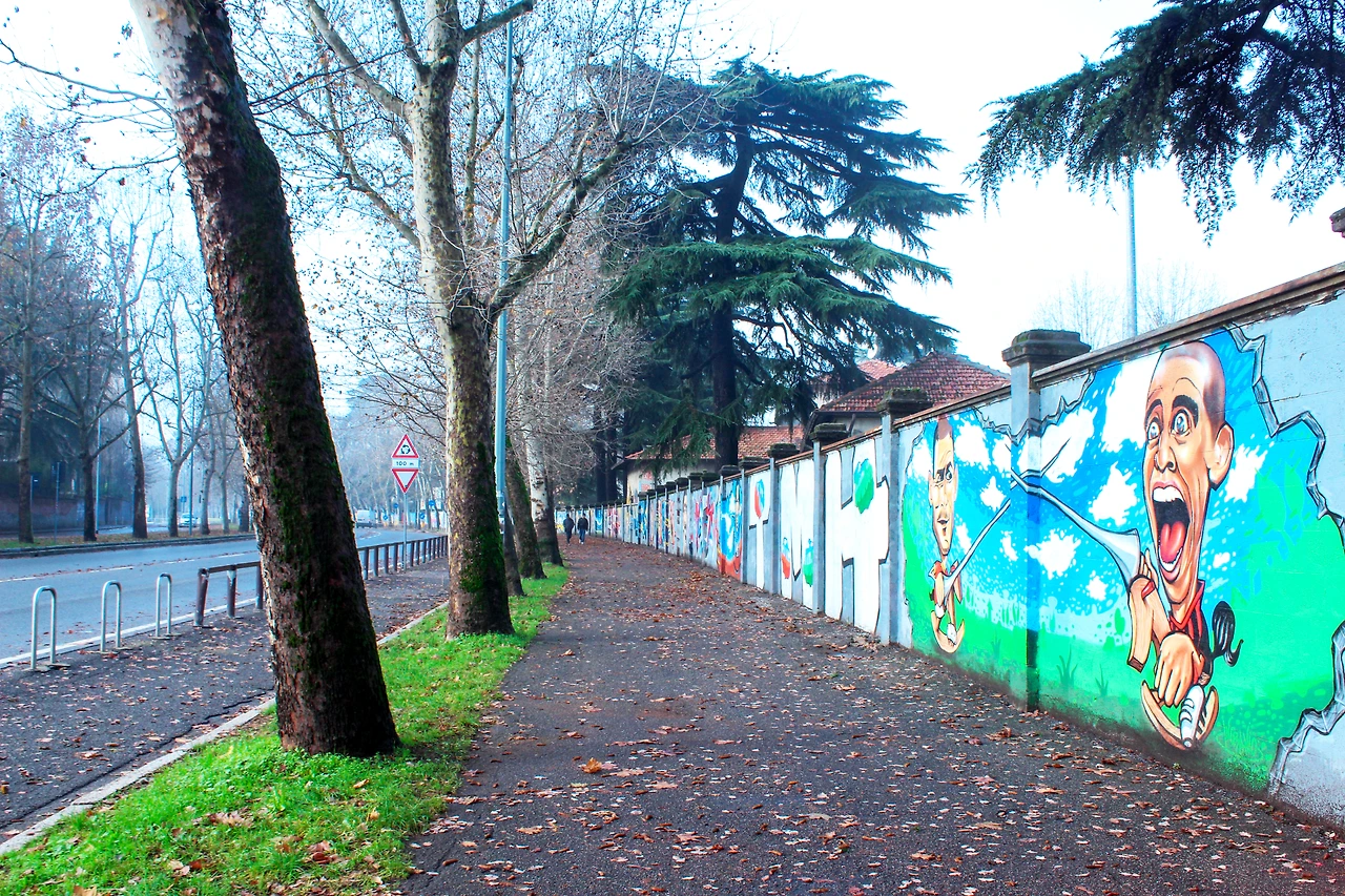 낙엽이 날리는 길 옆의 담벼락에는 AC밀란과 인터밀란의 선수들이 한 명 한 명 쭈욱 이어져서 그려져 있다. 그라피티 아트라고 하면 무조건 낙서처럼 생각해 오던 것이 거리의 예술로 자리 잡고 있듯이 경기장을 향하는 길에 이렇게 선수들의 모습을 볼 수 있다. 루니, 메시, 체흐, 발로텔리...(선수 이름은 아들이 알려주었음)