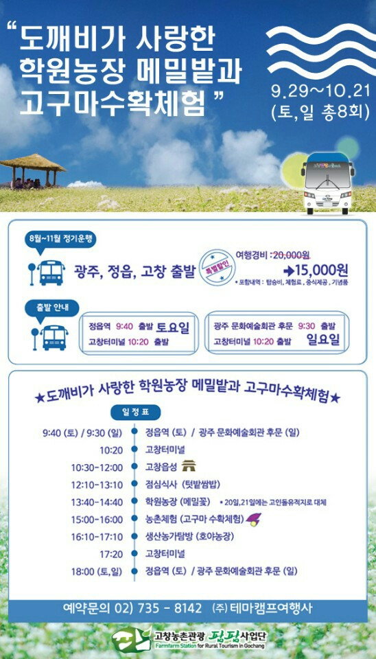 정읍역(토), 광주문화예술회관(일) 9.40분 출발 / 고창터미널10.20분(토.일) /예약전화 : 02-735-8142~3