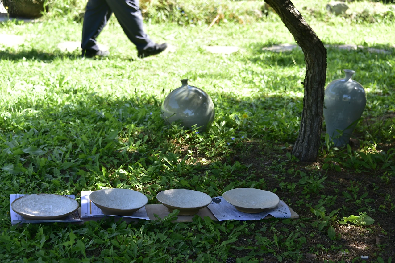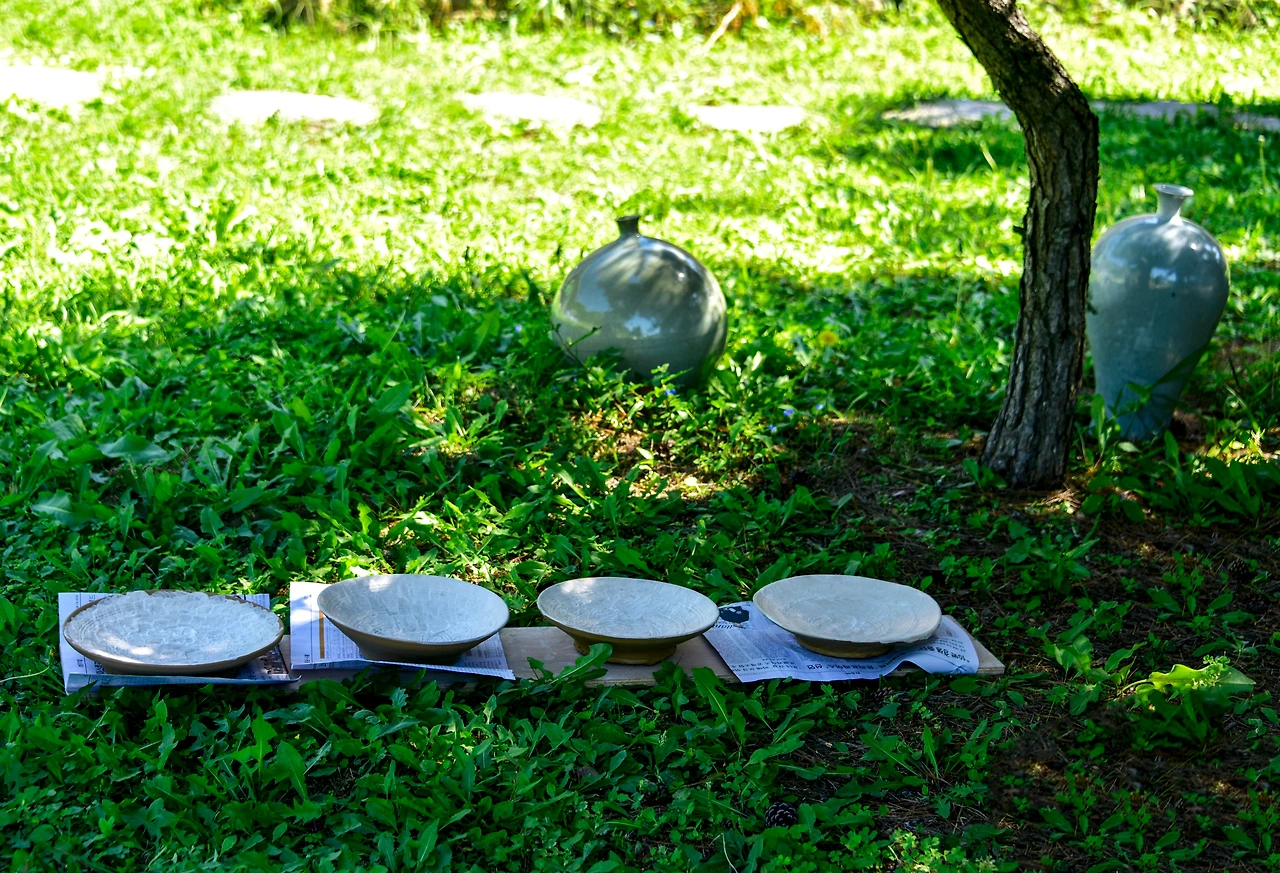 유약을 바르고 나무 그늘에서 말리면서 산들바람맞으며 쉬는 시간은 마치 신선 인양 평온하다. 풀밭의 군데군데 놓여있는 도자기가 멋스러운 풍경을 더해준다.