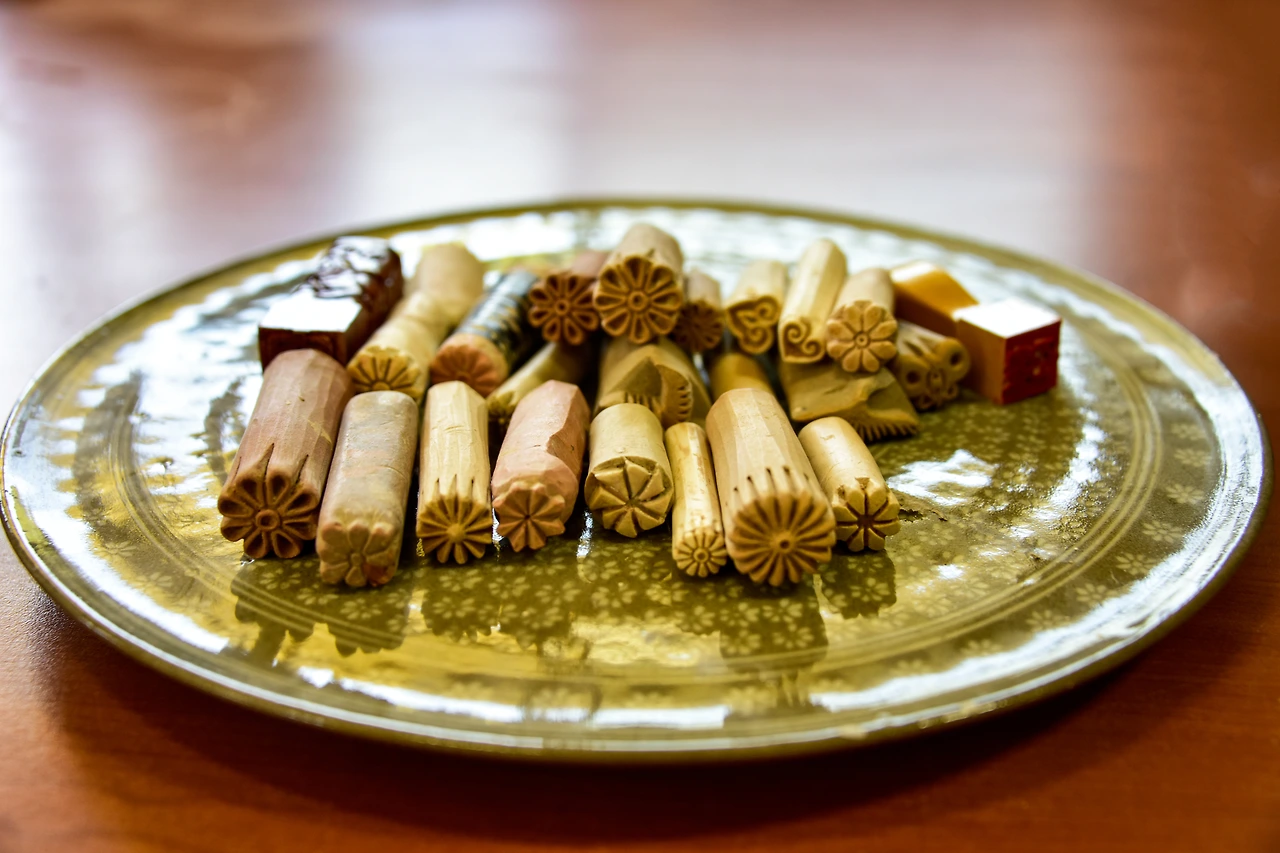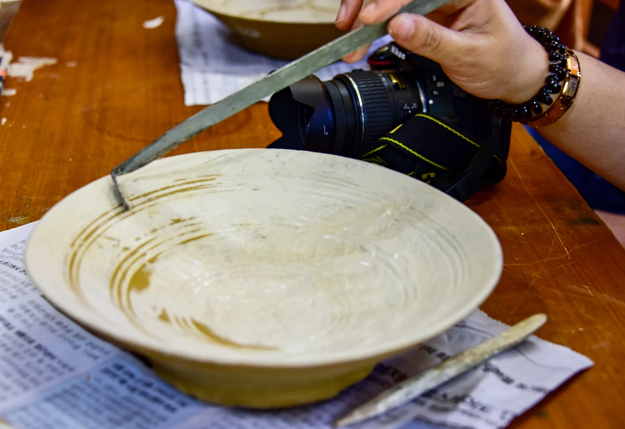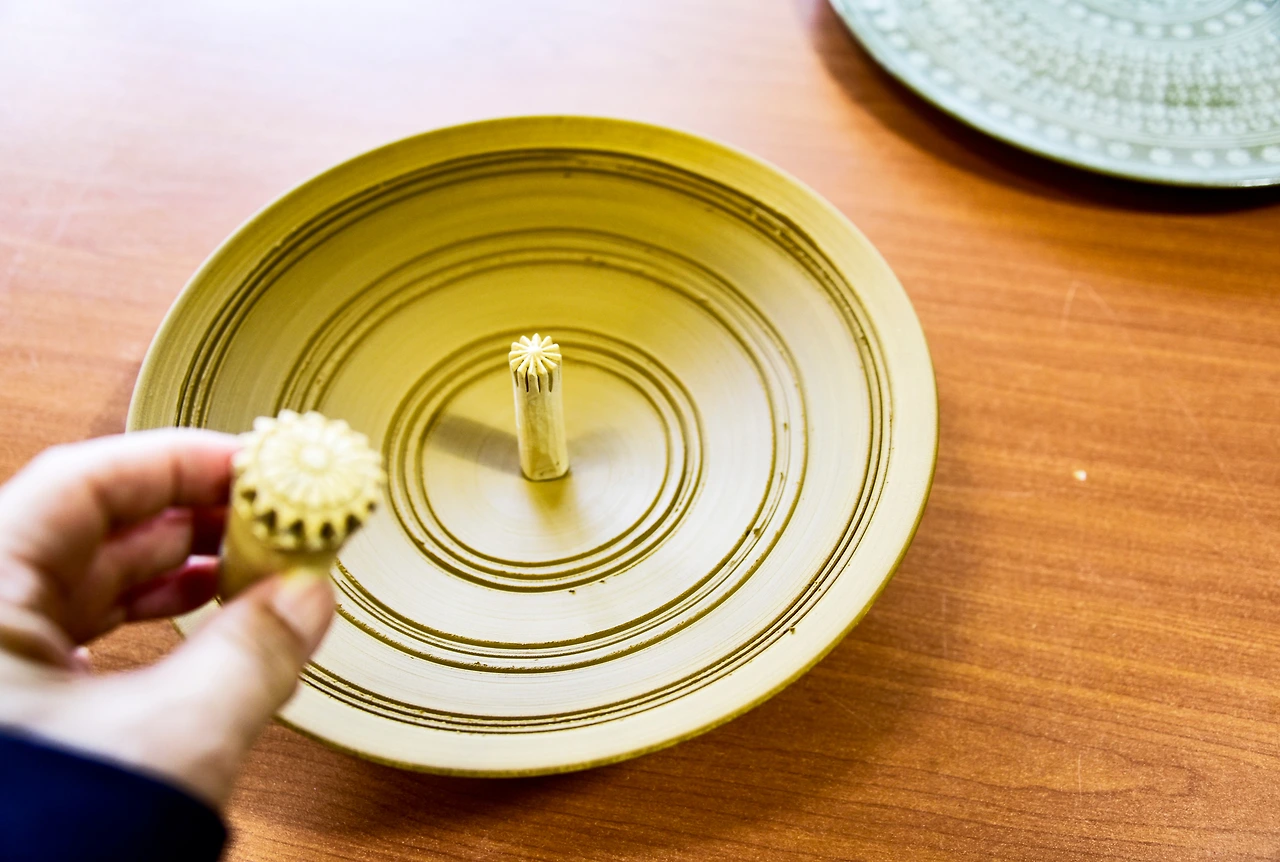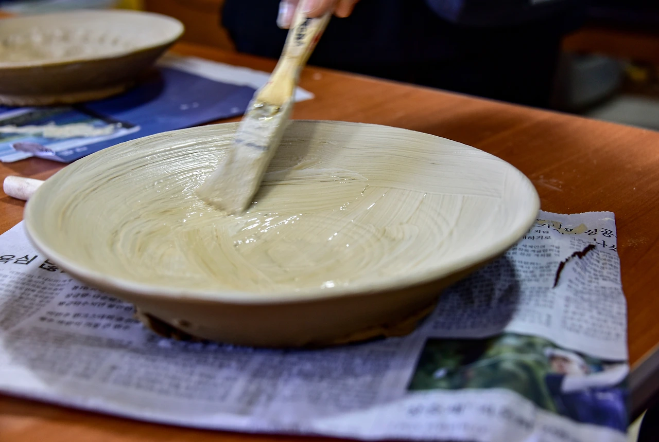 먼저 물레를 돌려 만들어진 그릇에 인화문 도장으로 무늬를 잘 찍고 상감칠을 한다. 그리고 가을볕이 내리는 바깥의 나무 그늘에서 꾸덕할 정도로 말려서 긁어내는 과정을 거친 후 가마에 굽는다. 구워내는 시간이 길기 때문에 구운 것은 각자 집으로 보내준다고 한다.