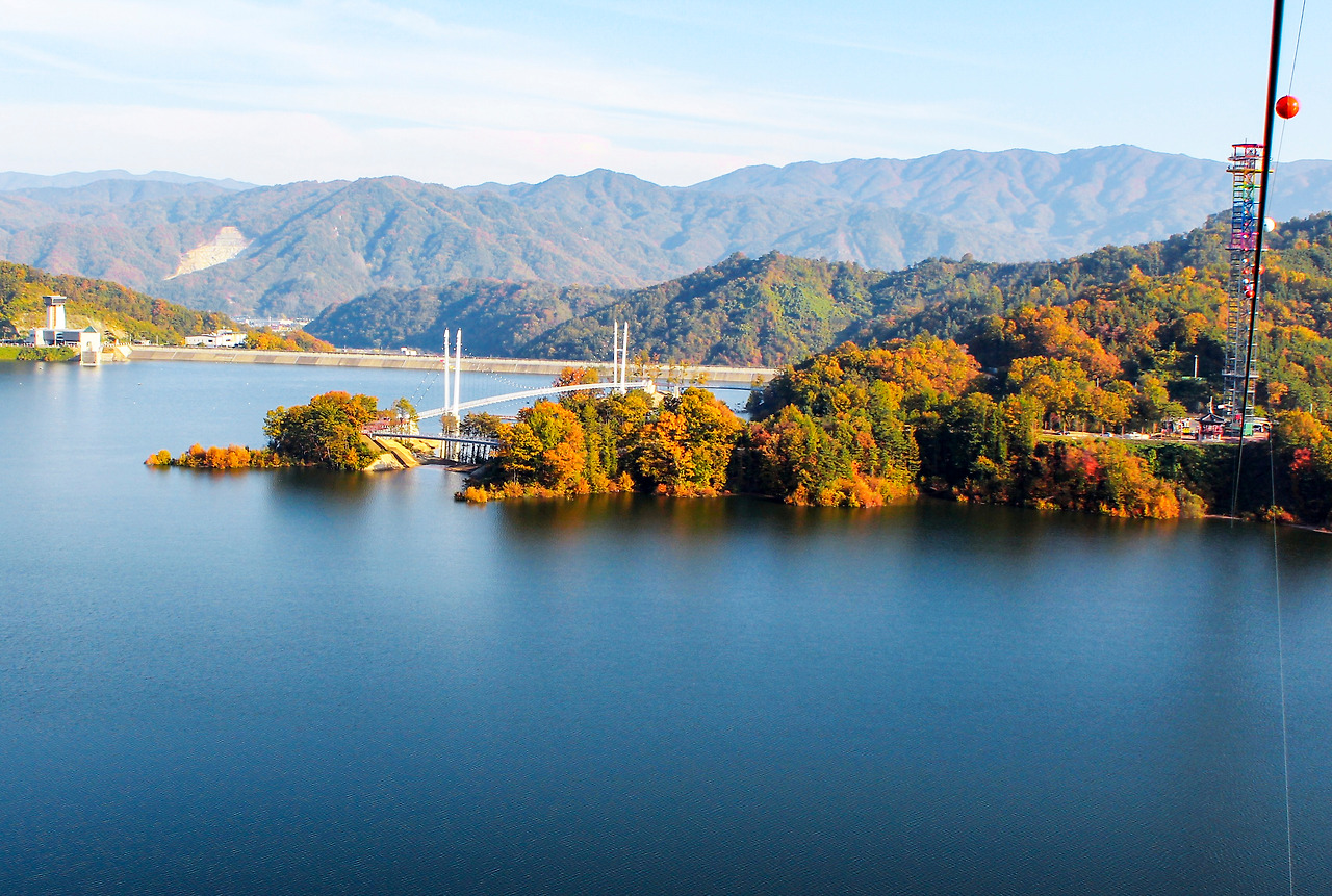 부항댐 상공을 가로지르는 레인보우 짚와이어는 높이가 94m로 국내 인공 구조물 중에서 최고 높이라고 했다. 댐 양쪽에 설치된 타워를 이용해서 발 아래 풍광을 즐기며 물 위를 왕복 1.7km를 왕복하는 스릴을 맛보는 건 빠뜨릴 수 없는 코스다. 바람을 맞으며 짚와이어를 타고 쏜살같이 날아 왕복으로 오가고 나면 그동안 쌓였던 모든 체증이 날아간다.