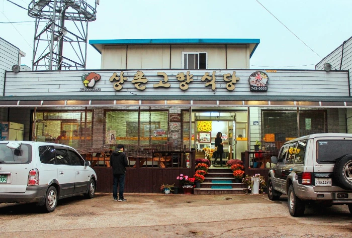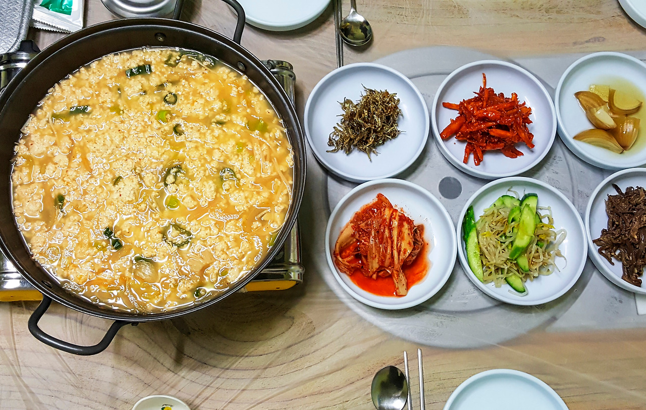 <민주지산 휴양림>에서 하루 묶고 나면 입구의 <휴양림 민박식당>에서 맵지 않고 부드러운 순두부찌개를 맛볼 수 있다. 특히 주인어른이 직접 채취한 고사리 나물이나 더덕무침이 맛있다.