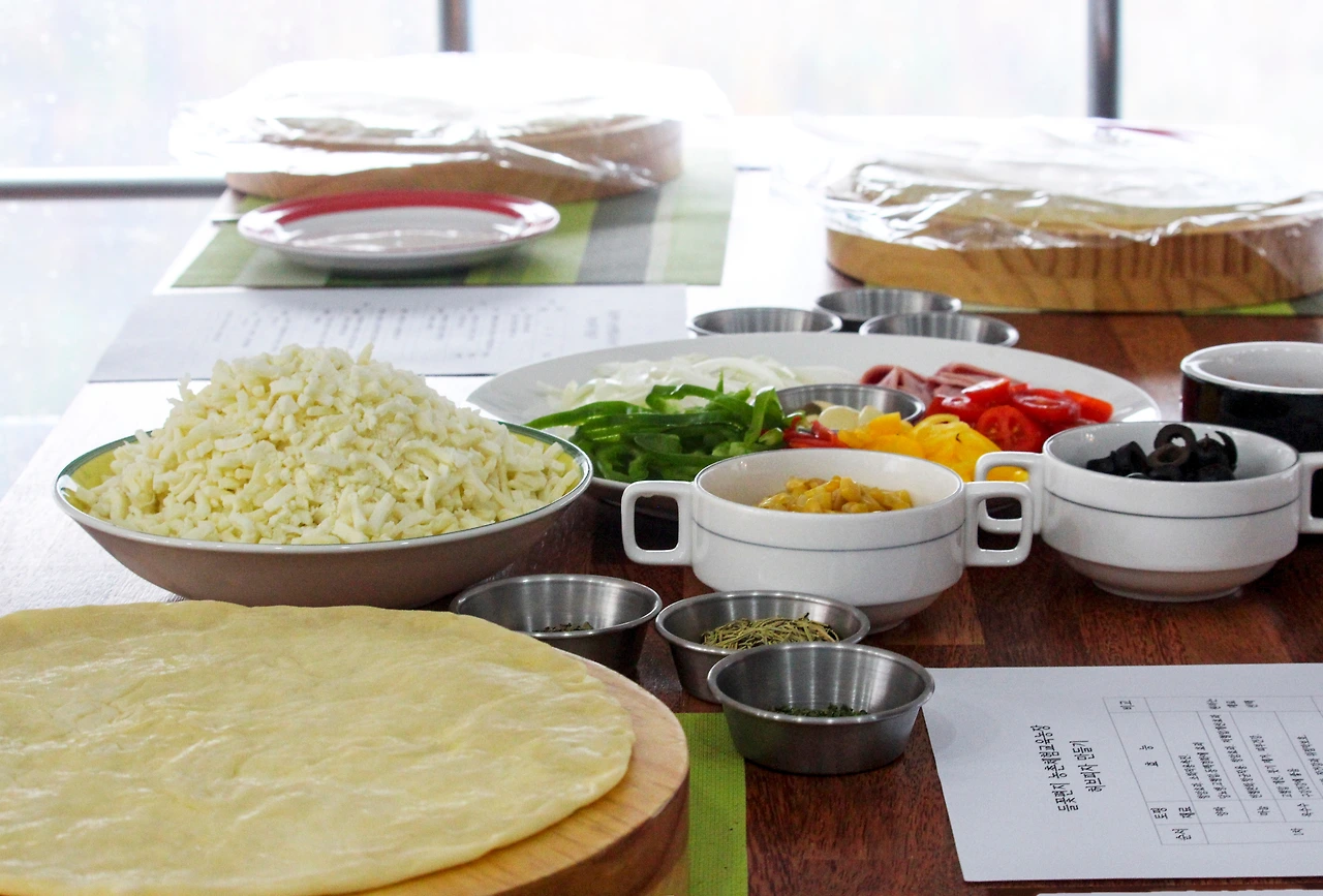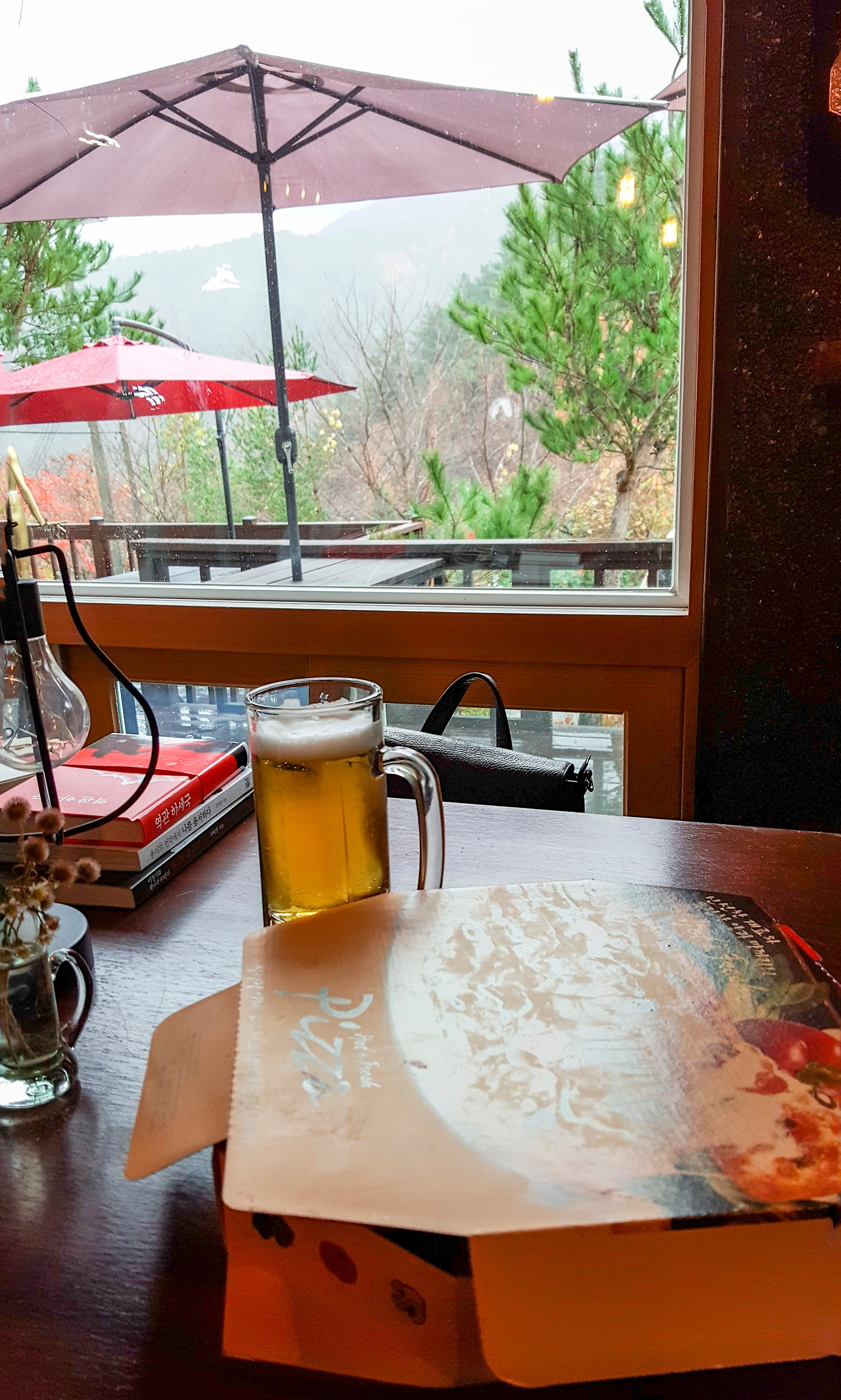 들꽃편지 프로그램 중에서 우선 허브피자 만들기를 했다. 신선한 재료와 치즈 듬뿍 얹어 구운 피자의 맛은 시중의 비싼 피자에 비할바가 아니다. 즉석에서 생맥주를 내려 피자로 점심식사를 했다. 그렇지만 그래도 밥을 먹어야 식사를 한 것 같은 한국사람이기에 배추 된장국을 끓여놓았다는 주인장의 인심에 감동했다. 창 밖으로 내리는 비를 바라보며 이처럼 산속에서 보내는 여유로운 시간이 얼마만인지..